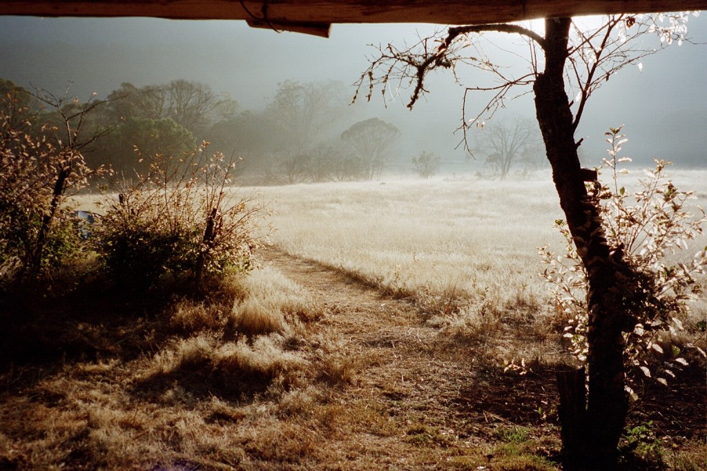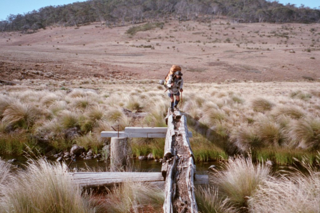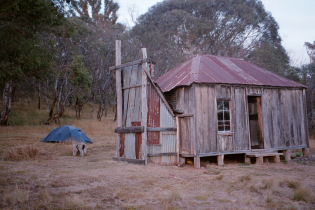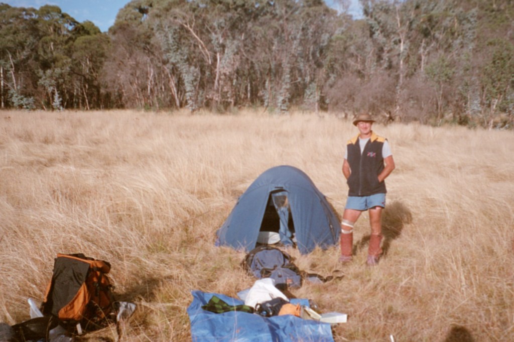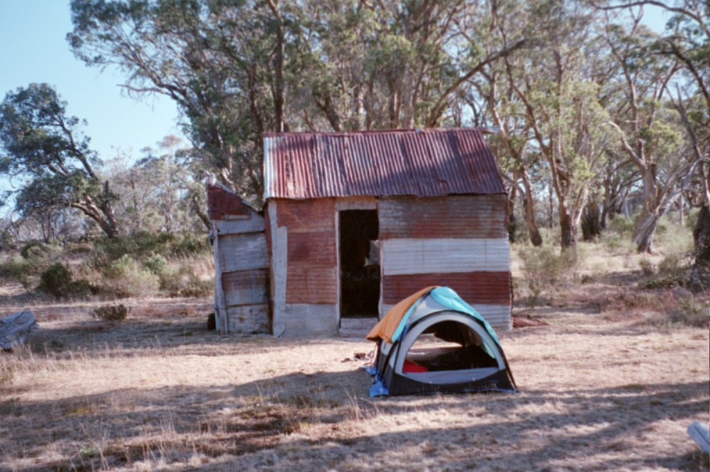 We had a good day. We left Witses and crossed Blanket Plain, up and over the divide and down to the Murrumbidgee River where there’s a ford and a very interesting foot bridge. It’s the remains of the original bridge with only one log crossing over now. We set out cross country above the Murrumbidgee and saw our first AAWT markers for a while. We descended down to the Murrumbidgee again and then followed a gully up to a saddle. Then down to Dairymans Creek. From there we headed northish until we reached the old Rules Point to Currango telegraph line which we followed until it veered off to the Port Phillip fire trail. We stayed on the original bearing until we found some wheel ruts which we followed down to Millers Hut. Millers Hut is quite lovely. The High Country bushwalking club who looks after it have done a wonderful job. It’s a bit plain on the outside, just corrugated iron but the inside is very nice. Unfortunately, my knee got worse and worse yesterday especially on the cross country bit. I’ve got it strapped up well and truly so I hope it will get me through the day. I had a rough night last night. Every time I rolled over or stretched or bent my leg I’d wake up with the pain. While we were cooking tea last night, three people came along on horses and we chatted for a while. They’re camped over at Ghost Gully which we’ll go past today before turning off on to the Mosquito Creek fire trail. We’ll follow it over Blue Water Holes Saddle and down on to the Coolamon Plains. We’ll make a decision there depending on how I’m feeling whether to stop at Blue Water Holes or push on to Oldfields. Today was the first day we’ve woken up with frost on the tent. It’s a beautiful Autumn day.