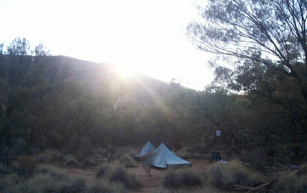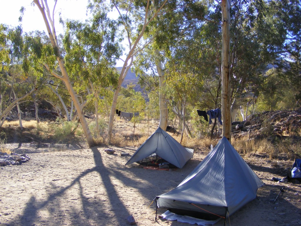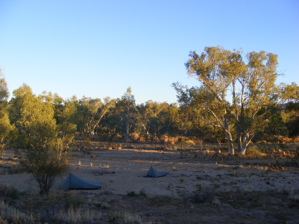 and very high tech composting toilets. There is no doubt that the campsites along the Larapinta are more than adequate. This one was however already occupied by a group of four, three Richards and Mary and Kelly. I asked about the third Richard and we were told he was camping on the other side of the Finke. Whilst they did offer to share, we declined and headed back to the Finke as there were no suitable campsites around the shelter. We found a lovely sandy site in the bed and as there were no forecasts for rain for the next few days we pitched our tents and had a cup of tea. As the site was very sandy we had to use rocks to hold our pegs in the ground. We spent some time talking and watching for meteors and satellites. Niv mentioned that camping here was fulfilling one of his life’s goals as the Finke figured prominently in some stories from his childhood. The moon was much brighter that night and the ghost gums in the river bed really shone brightly. They are definitely named correctly. It started to get very cold so we turned in and I soon drifted off after reading for a bit. I was so glad we had packed for the cold of the night. I had a thermal top, satin boxers, beanie, faux silk inner and my Dandelion bag and I was very warm.