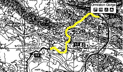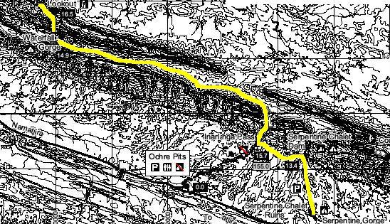 We had a lot of difficulty spotting the markers which indicated the route through. At one stage I completely lost the route and was looking around everywhere for a marker when a raven perched on top of the right hand cliff cawed loudly. I looked up at it and there high up but below the bird was a marker. We climbed up to it and the raven flew across the canyon to the cliff on the opposite side. We watched its flight and it perched high up but directly above another marker. Now, I’m not usually given to irrational flights of fancy but I did say, “Thank you” to the bird. We were soon out of the maze and standing at a track junction. Four kilometres to the west were the Ochre Cliffs and two kilometres east was the Serpentine Chalet Dam track head.