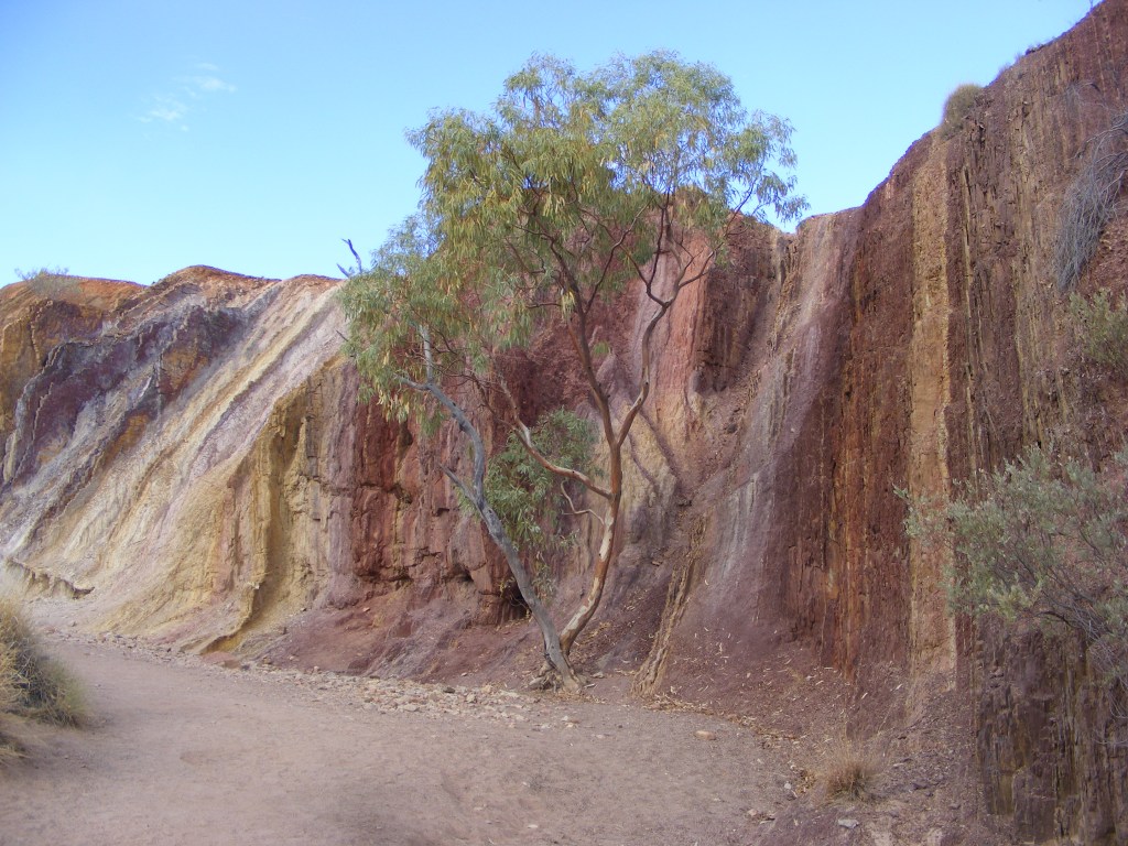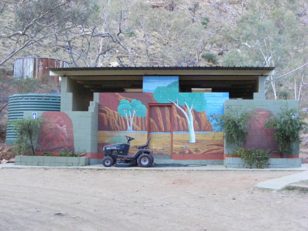 Saturday. And there wasn’t any water here so they built a dam further up the valley. Some other enterprising people built another resort further west at an incredibly beautiful water hole called Glen Helen which had magnificent views of the mountains which Albert painted and consequently Serpentine Chalet went bankrupt after only five years. We had a bit of an explore around and double checked our maps to make sure this was in fact where we were to meet up at the end of the week. I had my first inkling that there were to be no soft grassy campsites for us on this trip. The campsites around the chalet ruins were all just red dirt but they were flat. A bit further on were the Ochre Pits, a sacred site where the aboriginals collected different coloured ochres to be used as body paints in ceremonies. We wandered up to a viewing platform to view them. They were beautiful. Soft reds, yellows and browns stripped the cliffs. Unfortunately, a family with teenagers was there and they had descended from the platform and were streaking each other’s faces with ochre. Their parents were on the platform and filming them with a camcorder right next to the sign which promised a $5,000 fine for interfering with the site. I mean, what do you do?! It is one thing to profane something but to record the event is just stupidity.
