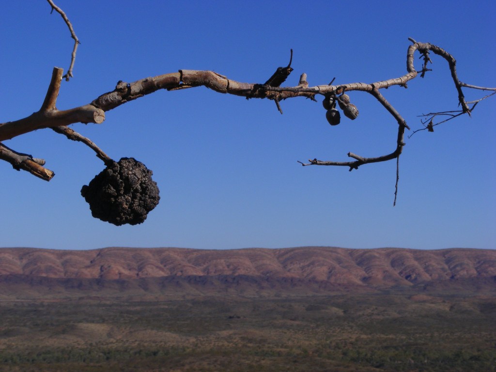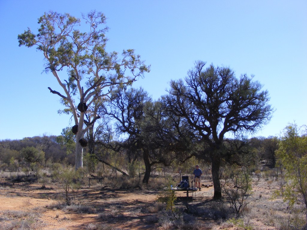 We dropped down off the ridge way and had a very easy six kilometre stroll through the desert to Wallaby Gap. There were bloodwoods and ironwoods as well as mulga scattered throughout the plain. We bypassed Fairy Spring and Scorpion Pool as we had been told they were dry and we soon reached Wallaby Gap camp. It had a nice shelter, a gas stove, a water tank, a toilet and picnic platforms. This was to be our final camp site on the trail.