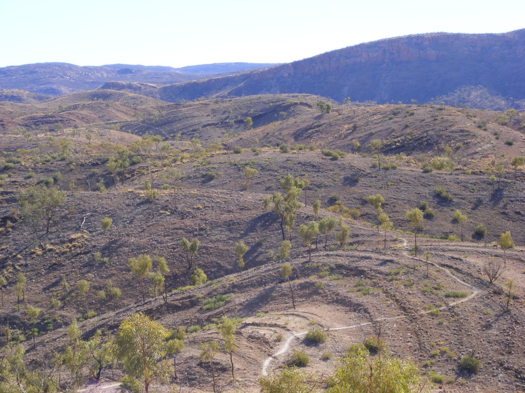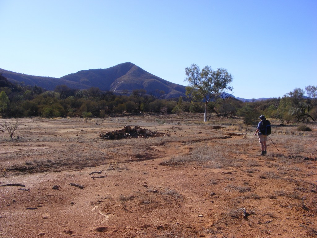 The actual summit of Mt Sonder is only a couple of hundred metres to the east of the cairn but involves a very dangerous descent from the cairn and an equally dangerous ascent to attain it. All the guide books warn against climbing it and we were quite happy to follow their advice. We had a long way to go and really didn’t want to jeopardise the rest of the trip. It was still quite cold so after signing the visitor’s book and taking a hundred odd photos we descended to a sheltered spot on the north side and ate our lunch overlooking the plains and the next line of ranges. The descent was quite fast and we reached the track junction at the bottom by two thirty. We agreed that a night at the bushwalkers’ campsite on Ridgetop would not be very pleasant and since we still had three and a half hours daylight left we decided to push on. I took our water bottles back to the tank at the picnic area and filled them before returning to Niv down at the creek bed where we had stashed our gear. We repacked and brewed up a coffee for afternoon tea. It was really delicious and agreed that this could become a tradition along the track. We were both pretty pleased with ourselves for conquering the highest point on the track relatively easily and early in the afternoon. This gave us a huge boost in confidence and allayed any apprehension we had in our abilities which would last for the rest of the trip. Mt Sonder, or Rwetyopme, and its surrounds are considered sacred so camping and fires are not permitted anywhere on the mountain. The track skirted around the southern base of the mountain and a strict no-camping zone exists for a long way along it. We determined we had to walk about five kilometres to be outside this zone so after we packed up we started off. At every kilometre along the length of the Larapinta Trail are markers telling the distance to or from the next track head. We always knew how far we had travelled and how far to go without all that messing about with map scale and such so we were pretty confident we would know when we were outside the no camping zone.