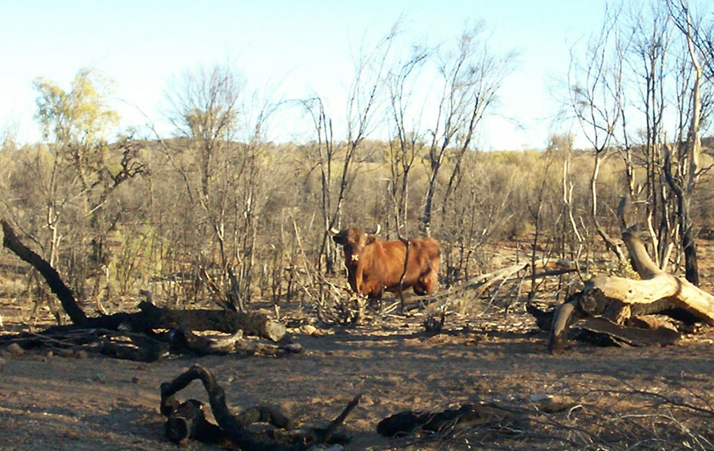 I switched off again which was a big mistake as it led to what could have been the end of the walk or even the end of me. The Larapinta had lulled me in to a real nonchalance about any dangers and it decided to remind me just where I was in a big way. I walked up a small crest and there, not five metres away, was the most dangerous thing I have ever encountered on a bushwalk. It was a full grown scrub bull. It was huge, muscularly, had about a one metre spread of horns and it was staring right at me. I was at a total loss as to what to do. I quickly scanned around for a suitable tree but they were all stunted sapling size scrubby things. I thought about doing a Harold but I knew there was no way I would get more than a metre before it was on me. I undid my waist belt and sternum strap in preparation for a fling and flight which I also knew I didn’t have a hope in winning. I was just hoping my pack would keep it occupied long enough for me to think of something else.