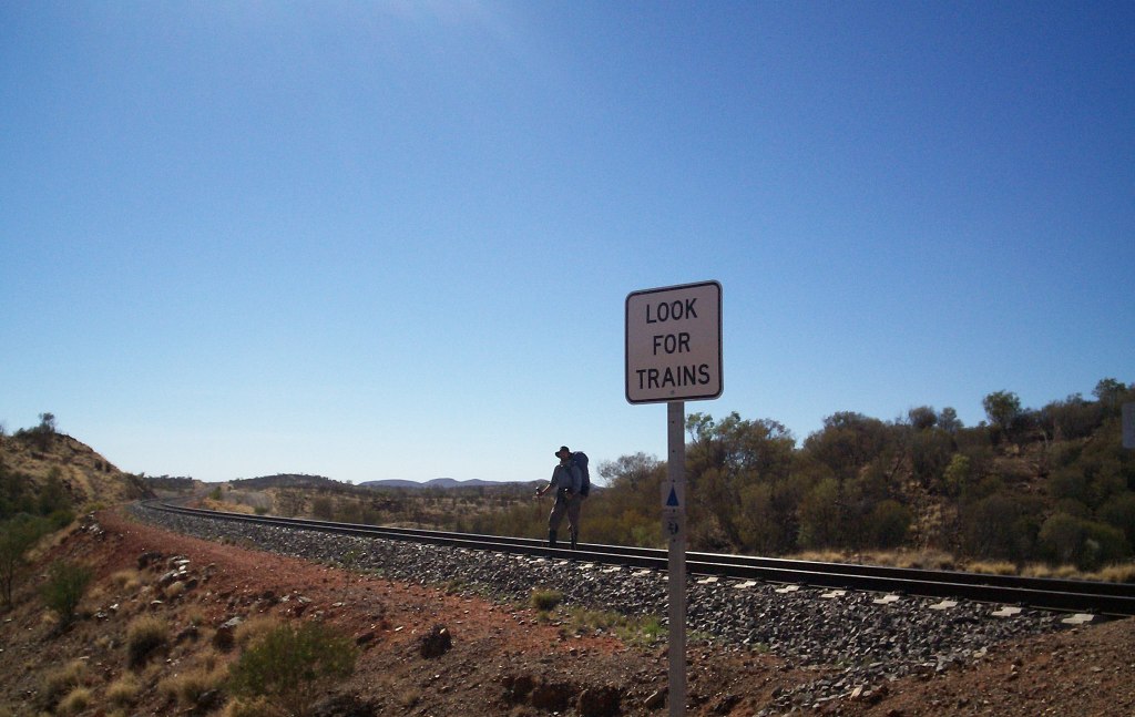 We soon dropped down off the ridge and the trail undulated for the next three kilometres through the desert plain until we reached the Alice Springs to Darwin rail line on top of a small saddle. It was hot again and the tracks shone like twin mirrors. Declining the invite to put my ear to one of the tracks to listen for a train we settled for taking shots of each other beside the “LOOK FOR TRAINS” sign.