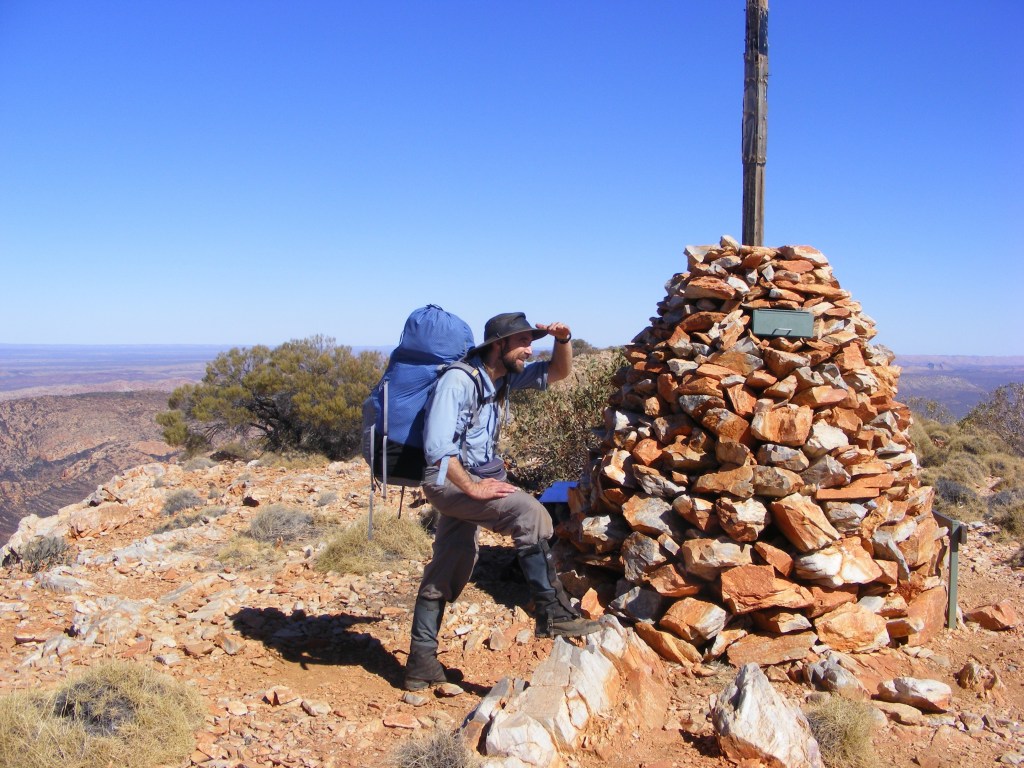 We sat in the shade of a lone white cypress, drank about a litre each and ate lunch. There is always a great sense of achievement felt after such a climb. The trail east to Giles Lookout was very rocky, indistinct and occasionally followed a very thin ridge way. After about three kilometres of this the top of the range opened up and we were soon at a very sheltered campsite to the side of the track. There was enough space for about six tents in three separate locations all joined by rock lined pathways. Sparse shade was provided by white cypress and mallee. Unfortunately, as I was setting up I discovered my water bladder had leaked again and I lost about two litres. I had plenty left but it