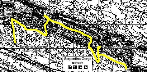 We loaded up all our water containers to see us through the next thirty hours. There would not be any water until we reached Serpentine Chalet Dam the following afternoon. I had my three litre water bladder, a four litre wine cask bladder which also doubled as an extra pillow and a one litre PET bottle, all full. Eight kilograms of water which effectively doubled my pack load. And every drop worth the effort.