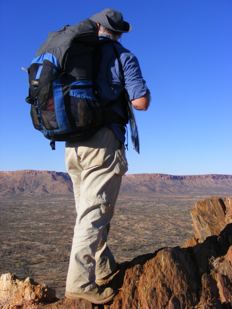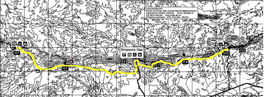 To tell the truth, I hadn’t even heard of the Larapinta until a couple of very good friends, Simon and Ali, moved to Alice Springs so Simon could take up a posting at Pine Gap for a couple of years. When they left Canberra I dutifully promised to visit. We emailed each other spasmodically for about six months when I became aware that there was a long walk west of Alice called the Larapinta Trail and that it was very popular. I looked up everything I could find on it. There is a remarkable amount of information available on the net. There’s even an entire web site administered by the Parks and Wildlife Advisory Council of the Northern Territory devoted to the trail. It is full of track notes, current conditions, who will be on the trail when and other mundane details like where to get water which could be rather handy to know in the desert. It also had twelve maps, one for each section, which I immediately downloaded and printed off. There was also two 1:250 000 scale maps of Alice Springs and Hermansburg which had the trail marked on them but at that scale were about as useful as a map of the London Underground in south-west Tasmania.