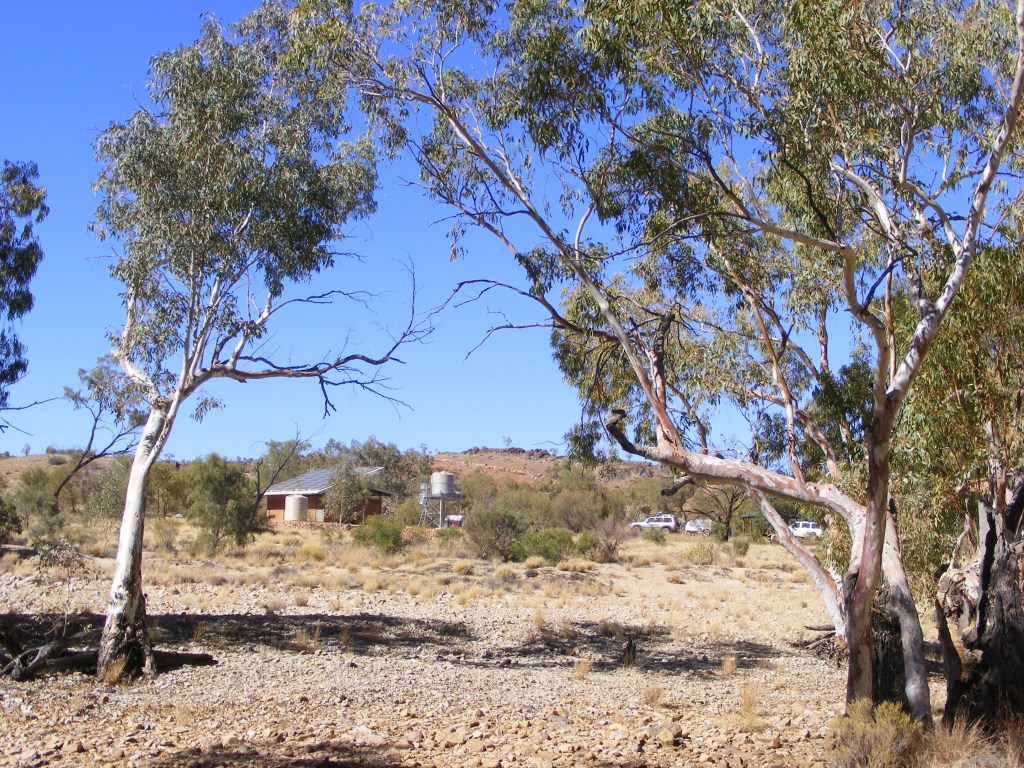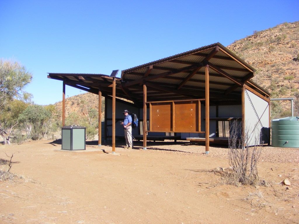 It was a very hot afternoon as we crossed the plain towards the Finke River and the Glen Helen turnoff. Early in our planning we had discussed the possibility of spending a night at the resort but decided against it. We reached the turnoff and turned north-east towards the campsite. After crossing the enormous bed of the Finke we climbed up the other side to what is known as the Finke Hilton. There are two of these along the trail, one at the Finke and the other at Jay Creek. They are enormous three sided shelters especially built for walkers. They have two huge sleeping platforms, cupboards for storing gear and food away from the animals, a gas cooker and BBQ, two water tanks