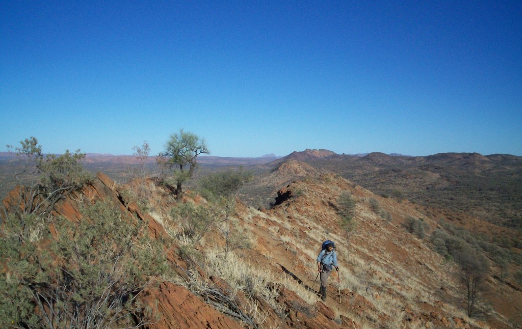 The decision to walk from west to east had been full of doubts as most guides are for walking from east to west but there have been several times along our route when we were really glad we were heading east. The first was climbing Mt Sonder. Knowing we had already done the highest peak was a real confidence booster for the rest of the trail. The climb down from Hilltop Lookout on the second day was also something we were glad we didn’t climb up as was the climb down to Waterfall Gorge. Now we had another reason to be glad we were heading east. From the summit of Brinkley Bluff the Larapinta follows the very narrow and rocky ridge of the Chewings Range gradually downhill to Reveal Saddle, four kilometres away. It was very hot, very hard on our feet and very hard going as we criss-crossed the ridge line at least a dozen times. Oh, and bear this in