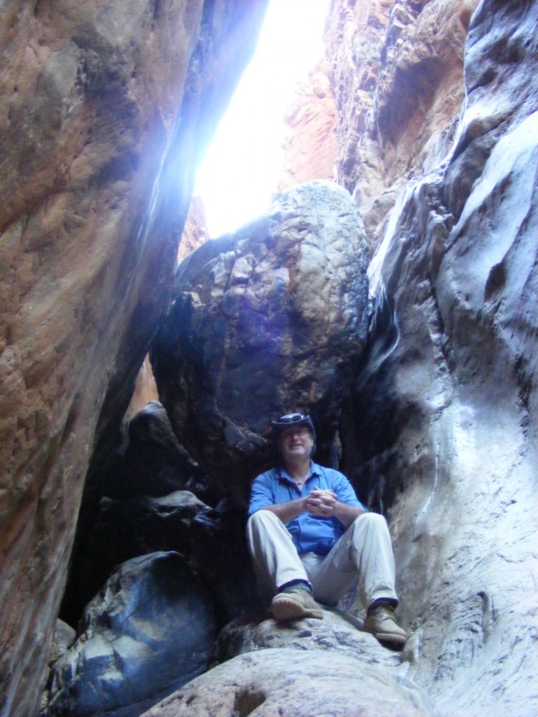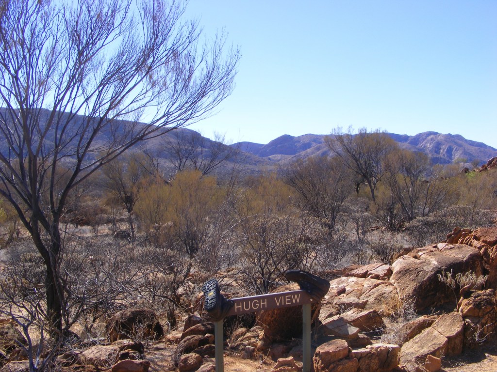 We were up early, breakfasted and packed long before the kiosk opened. We headed up in to the chasm and dropped our packs at the Larapinta Trail track junction before setting off to explore the chasm. It was narrow, huge and went a long way. After an hour’s exploration we returned to our packs and started the long two kilometre haul up to Gastrolobium Saddle. There were stone stairs for the initial climb before we dropped slightly down to Angkale Junction which we discovered could be reached via a tight squeeze out of Standley Chasm. If we had carried our packs through the chasm we could have avoided the long climb. There was a large sign on a log which read, “Alice