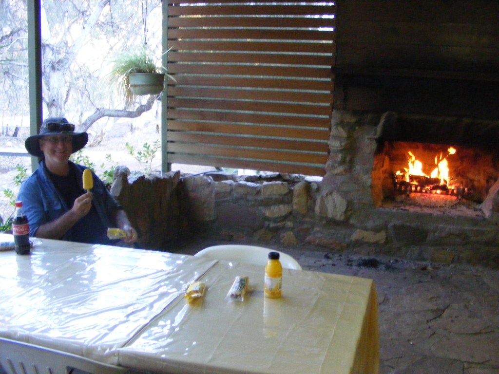 It was luxury. OK there wasn’t a lot of it but there was more than enough for us to set up our tents on. We set up and headed back to the kiosk where two very efficient girls were packing up for the night. I know it’s a real pain to have customers coming in two minutes before closing so we were really apologetic about turning up when we did. They didn’t seem fazed at all and very happily sold us banana paddle pops, cokes and a sausage roll each at half price because she said they would be thrown out anyway. The kiosk area had the kiosk, a gift shop with post cards, akubras and didgeridoos and a large verandah with tables, chairs and a large open fire burning. We retired to a table right next to the roaring fire and enjoyed our bounty. The pangs of banana paddle pop withdrawal eased and we relaxed.