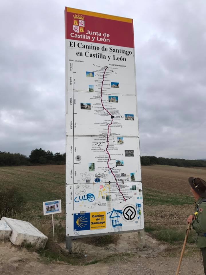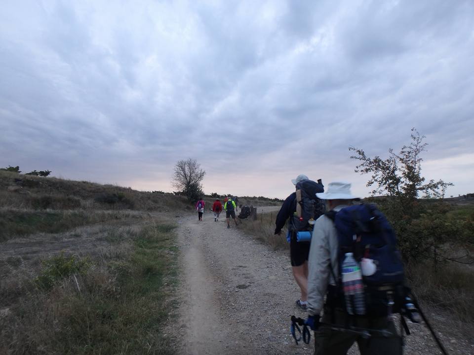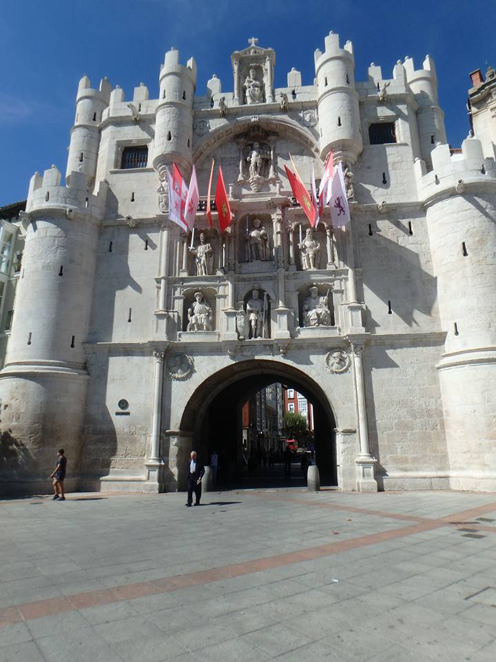 Day 14. 20 Kms. Atapuerca – Villaval – Castanares – Burgos. We left our albergue @ 0715 and climbed the Alto to 1050 m. in the dark to a spectacular sunrise with silhouetted wind turbines. When it got light we discovered we had bordered a military training area. Spanish omelettes for breakfast then on to Burgos for two nights. And to celebrate Leo’s birthday with a dinner with the current usual suspects. Kirsty, Jane and Cameron.