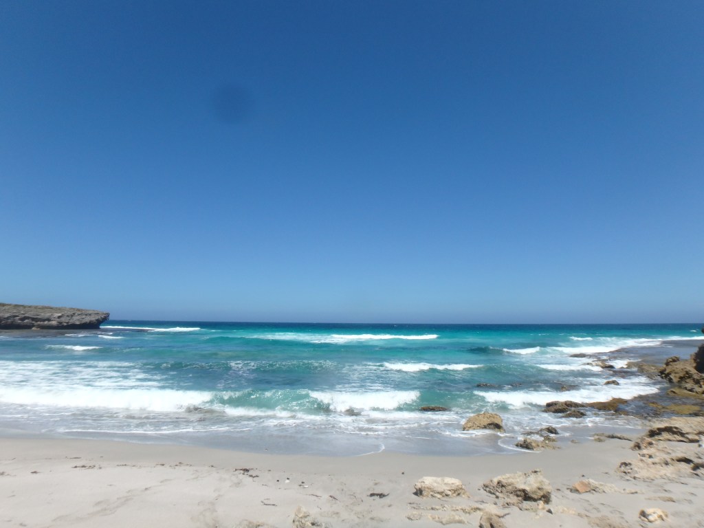 Another 7 a.m. start saw us meandering through some beautiful, tall and dense coastal mallee before reaching the Remarkable Rocks car park. Kylie & I explored Admirals Arch and the Remarkable Rocks on Sunday so we kept going following the clifftops to Sanderson Bay and the Banksia Campground by 10.30 a.m. We set up camp, had some lunch then headed for Sanderson Beach for the afternoon. We had a very relaxing time in the water and lying in the shade of a small cliff. Kylie and I are the only people staying overnight on the trail so we had our choices of campsites and were able to spread out. Only one other couple were walking it at the same time but they got dropped off and then picked up at the end of the day.