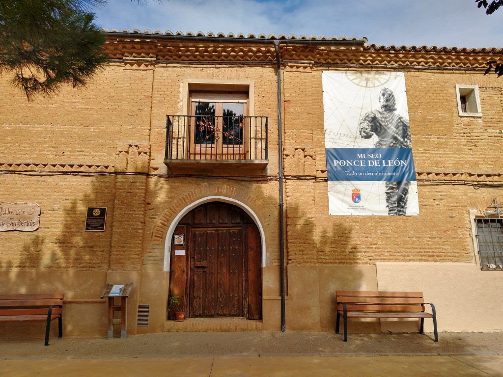 Las Flechas Amarilla. Day 13. Villalon de Campus – Santervas de Campos. 17 kms. A very nice stroll along the meseta on the GR124. The guide book says, “Follow the Camino signs on to further farm tracks, giving open views of the meseta.” Or, as Fred says, “A whole lot of nothing.”We got to our albergue by 11.30. It’s an old monastery and definitely the best albergue so far. Clean, airy and spacious. After showers, our hospitalerio served us up a lentil stew with salad for lunch. He’s currently making a bolognaise sauce to go with pasta for supper. This place is getting one big donativo when we leave. not only is this the best albergue so far, it also has a museum in the monastery wine cellars dedicated to Juan Ponce de Leon, the first westerner to reach Florida and discoverer of the Fountain of Youth. Bear on mind, this is in the middle of the meseta. ⛲