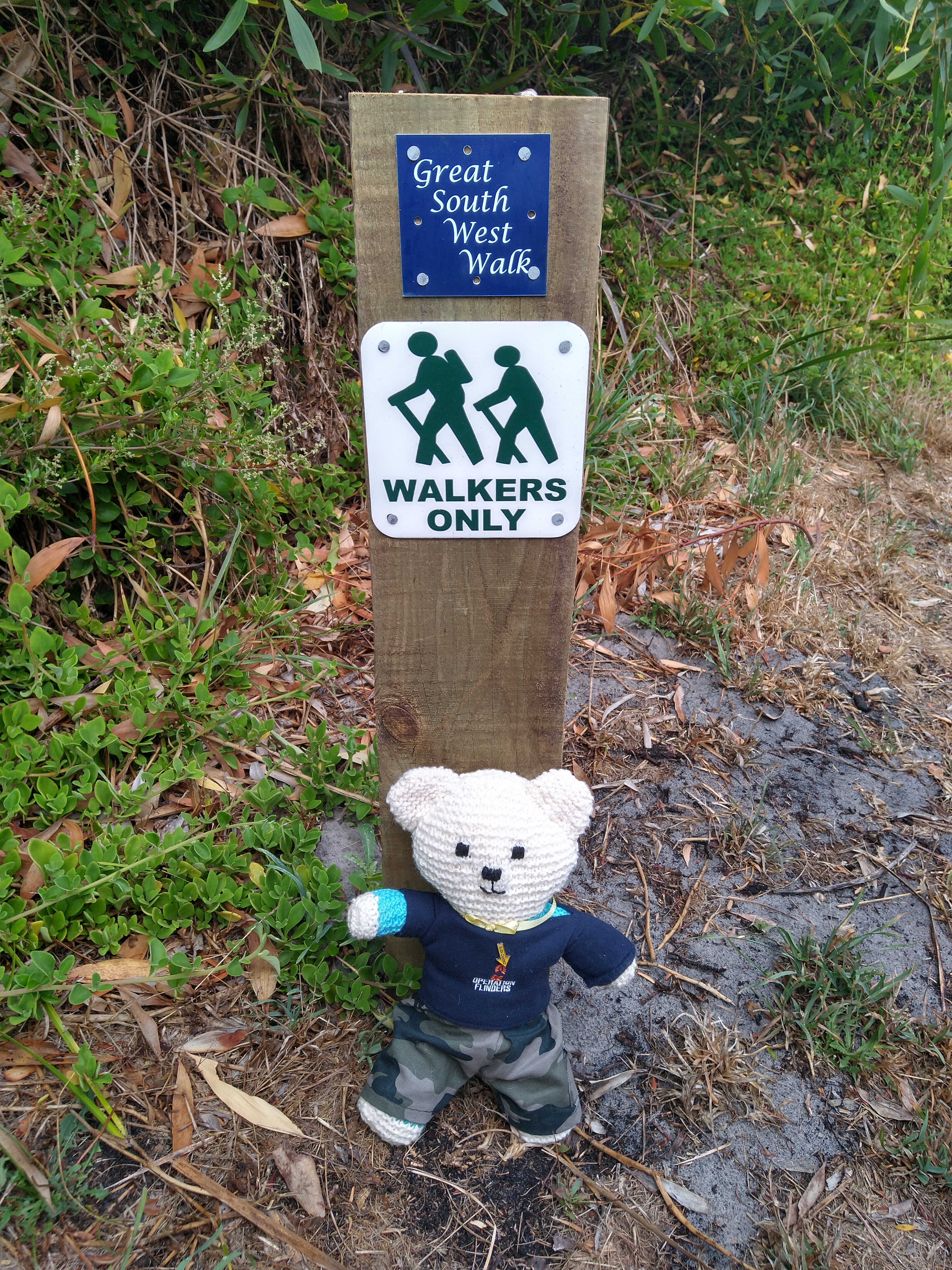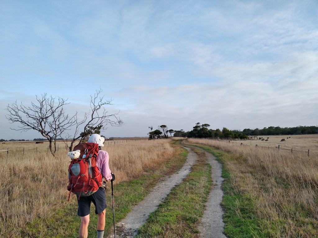 The web page stated it started in Portland, Victoria, and followed the Great South West Walk west for five days along the coast to Nelson. From Nelson, it continued west along the coast to Port Macdonnell in South Australia then north to Mount Gambier, Bush Haven, Kalangadoo, and, finally, Penola. It is based on Mary MacKillop’s journeys in the late 1800s. It listed it as about 240 kilometres over twelve days, so I sent off for the guidebook and put some feelers out on a few of my Facebook group pages. We soon had a party of five (Chris, Carlo, Boni, Carolyn, and I) plus a bear.