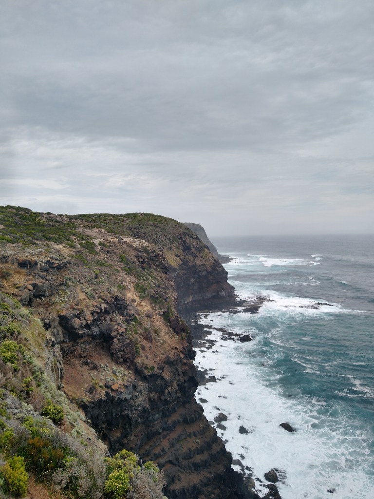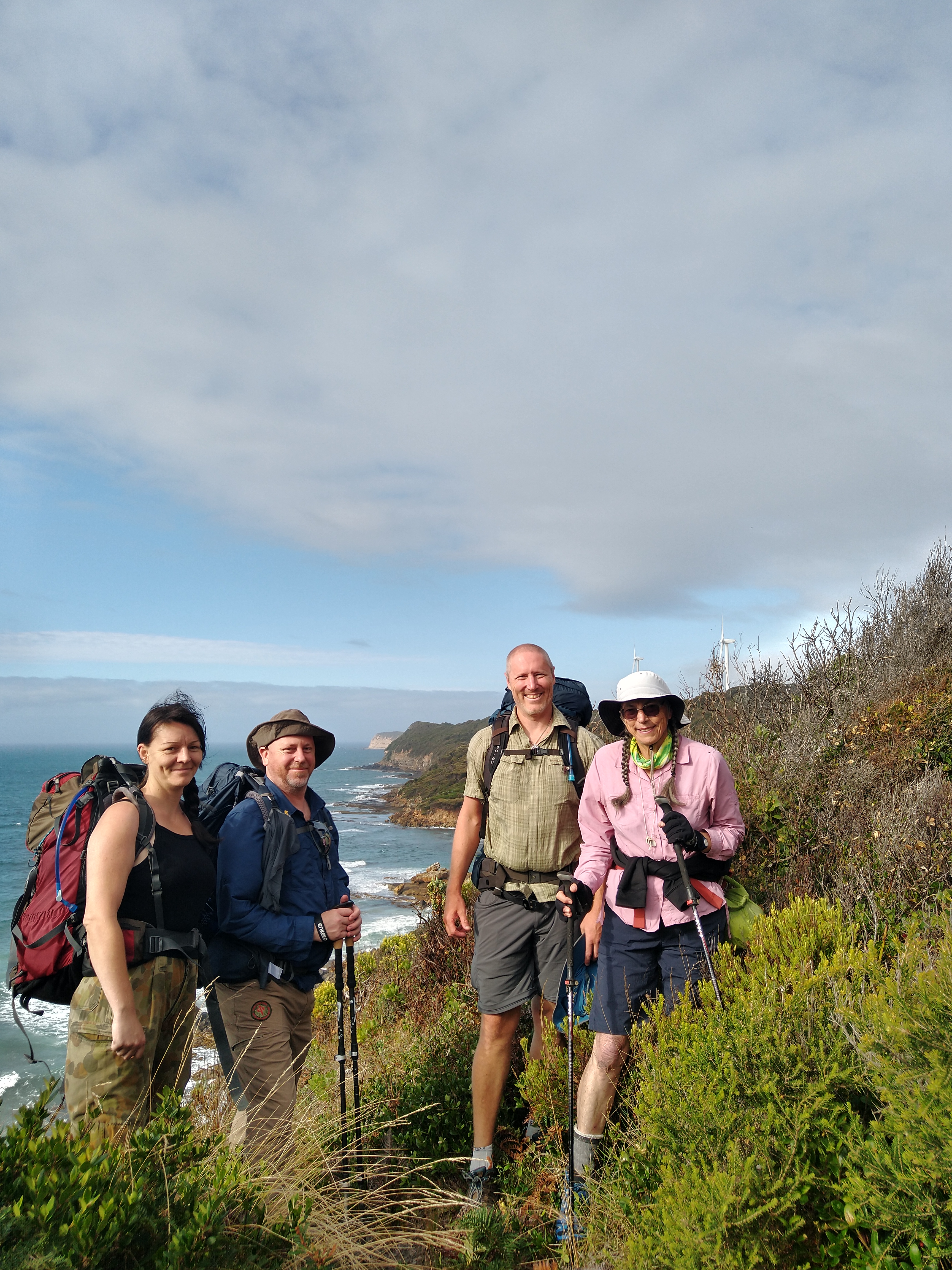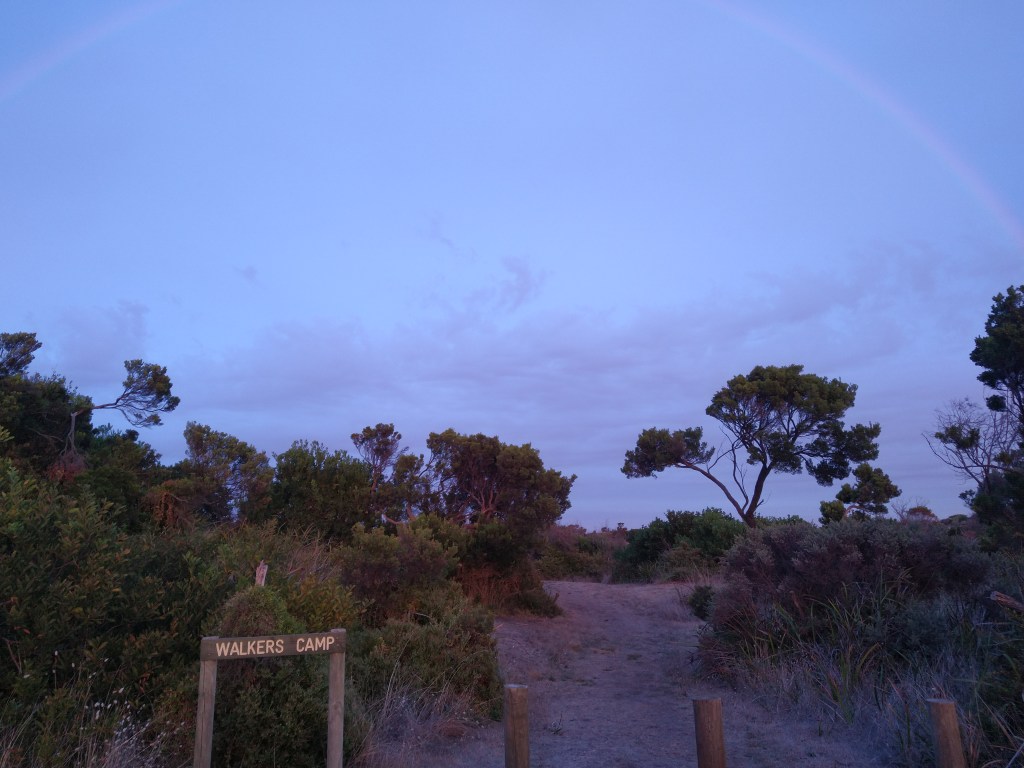 el Camino Australiano . Day 1. Portland – Cape Nelson – Bridgewater Bay – Trewalla. 25Ckms. A lovely first-day walk following the cliff section of the GSWW. A few drops of rain but not as much as we feared. It was 6 KMs of the beach after Cape Nelson which was a lovely way to finish the day. I forgot how much fun it is to climb sand dunes with a pack on. Not.