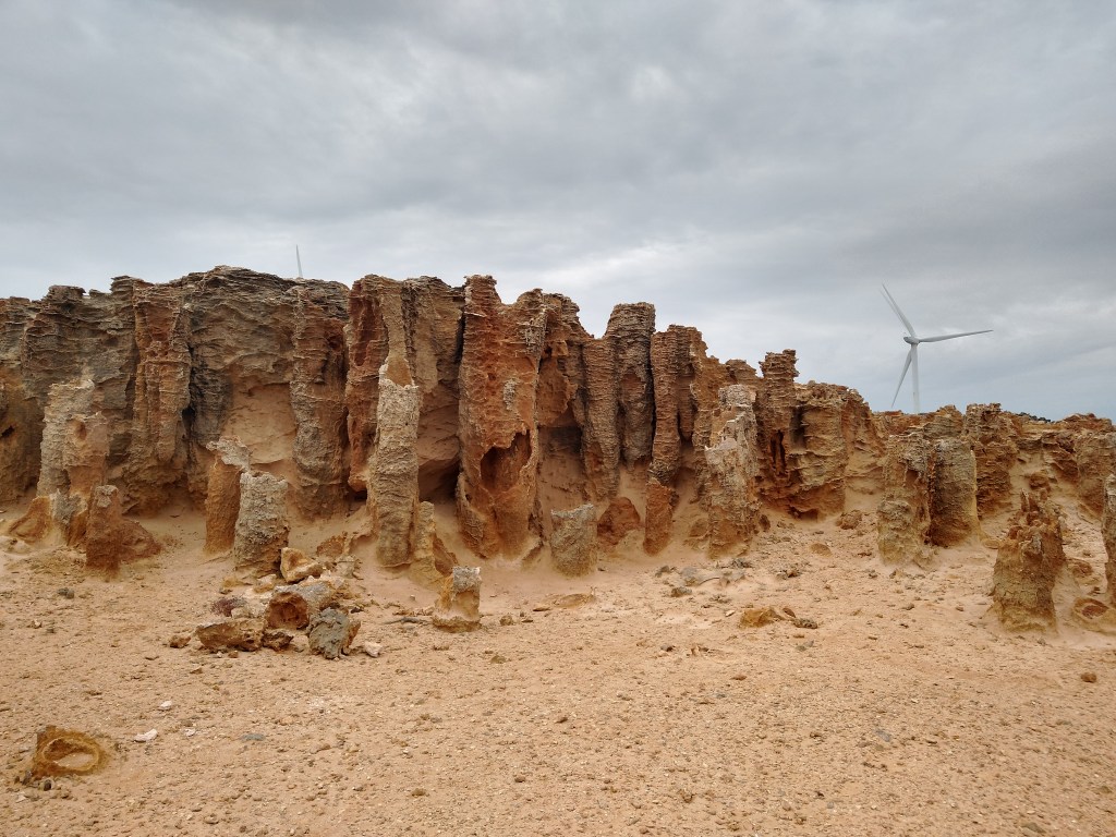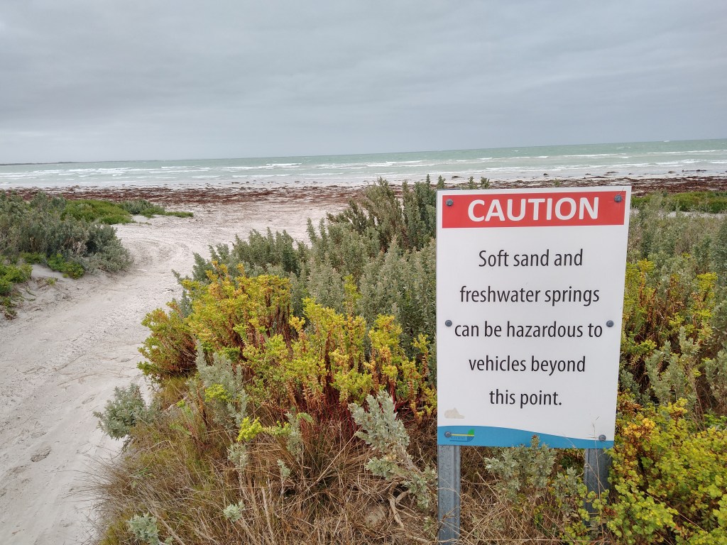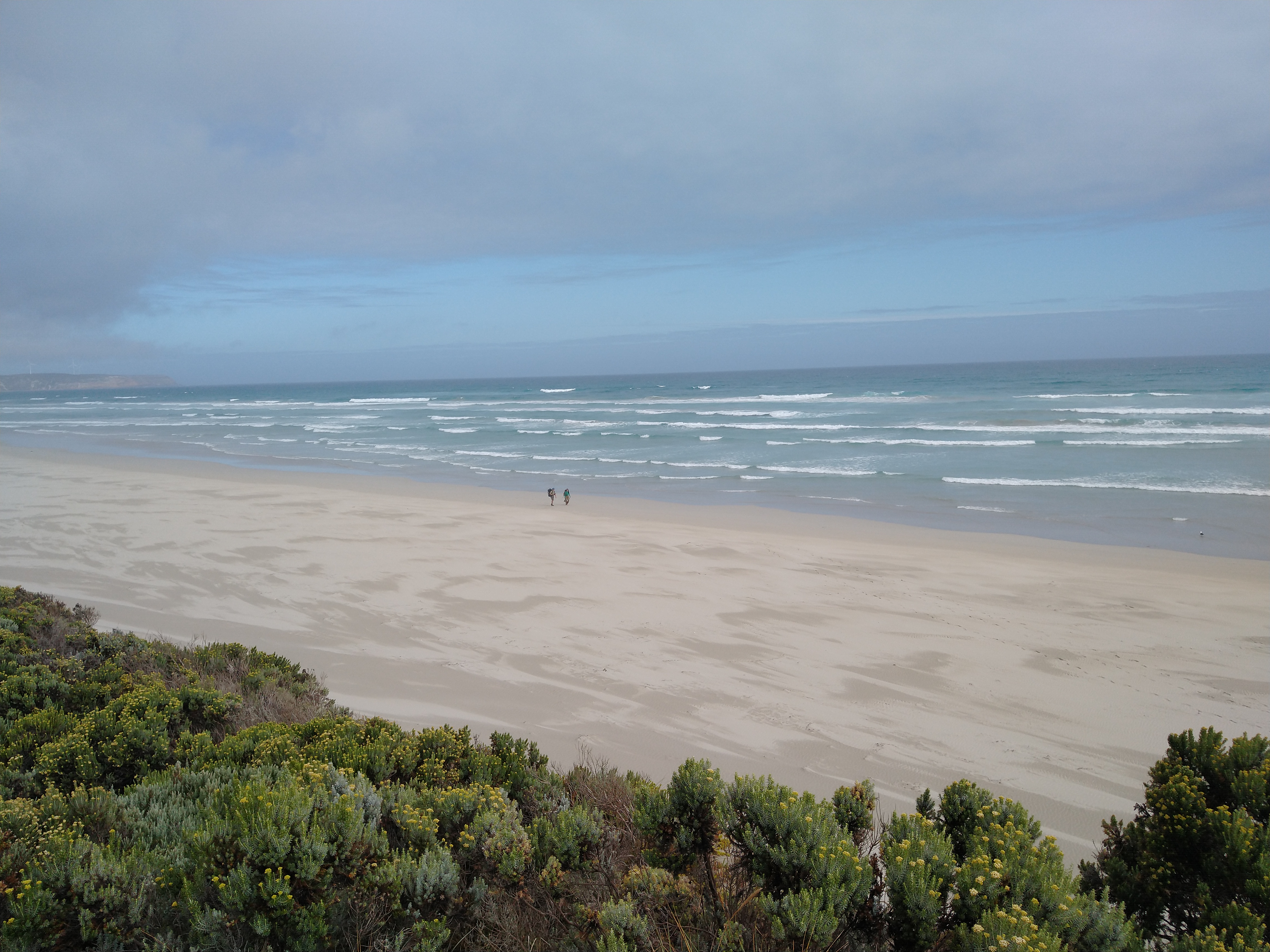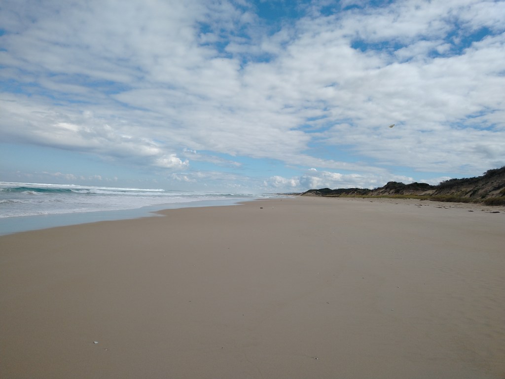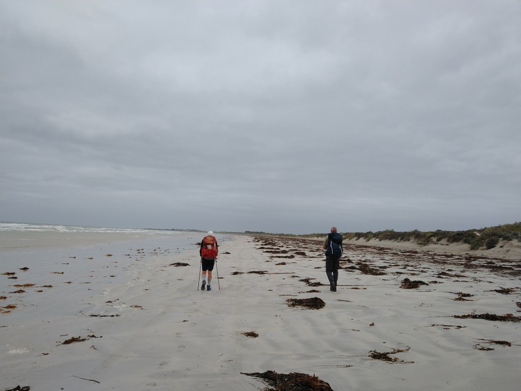 el Camino Australiano. Day 6. Nelson – Piccaninnie Ponds – Brown Bay. 23 Ckms. It rained all the way from Nelson to Piccaninnie Ponds then cleared on time for morning tea. Then it was back on the beach but different. The clouds rolled back in, a gentle on-shore breeze and nice firm sand all the way to Brown Bay. A lovely 10 Kms on the sand.