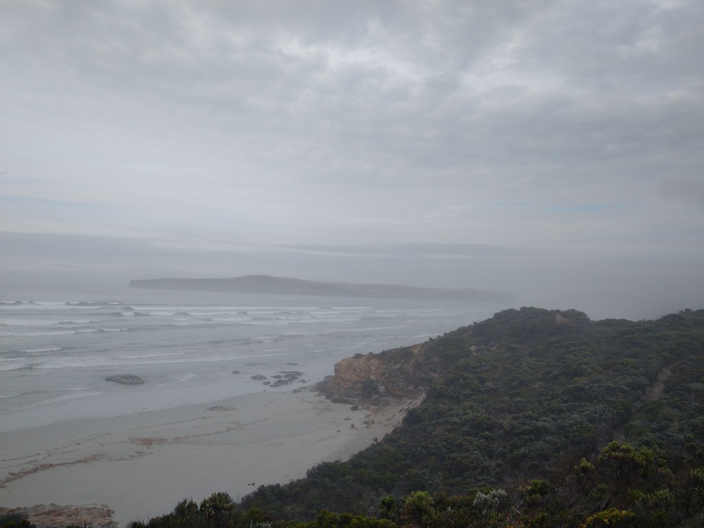 el Camino Australiano. Day 2. Trewalla – Cape Bridgewater – The Springs – Tarragal. 28 Ckms. A big day. The first 6 KMs were dune tops and beach to Cape Bridgewater Cafe where Cafes con leche were a treat and our second stamps then some long climbs through sea mist to Cape Bridgewater itself. Bridgewater Bay is the caldera of a 2-million-year-old volcano and from the Cape you can see the distinct shape. Then it was a very, very long afternoon. It started raining near The Springs and stayed till the end.