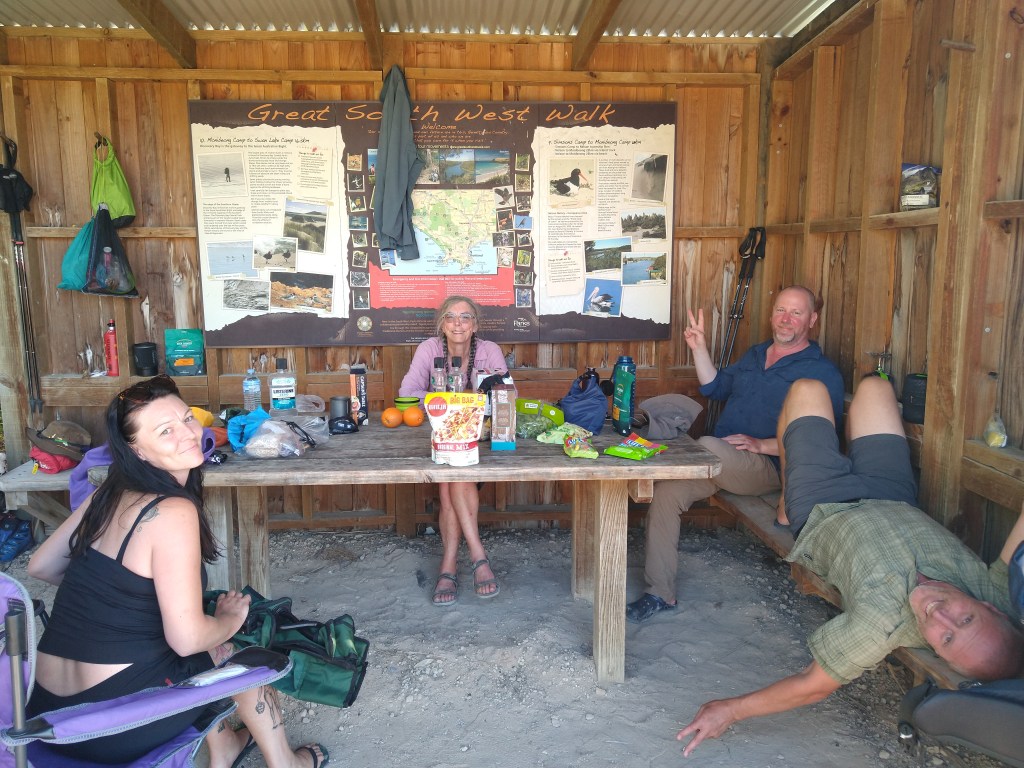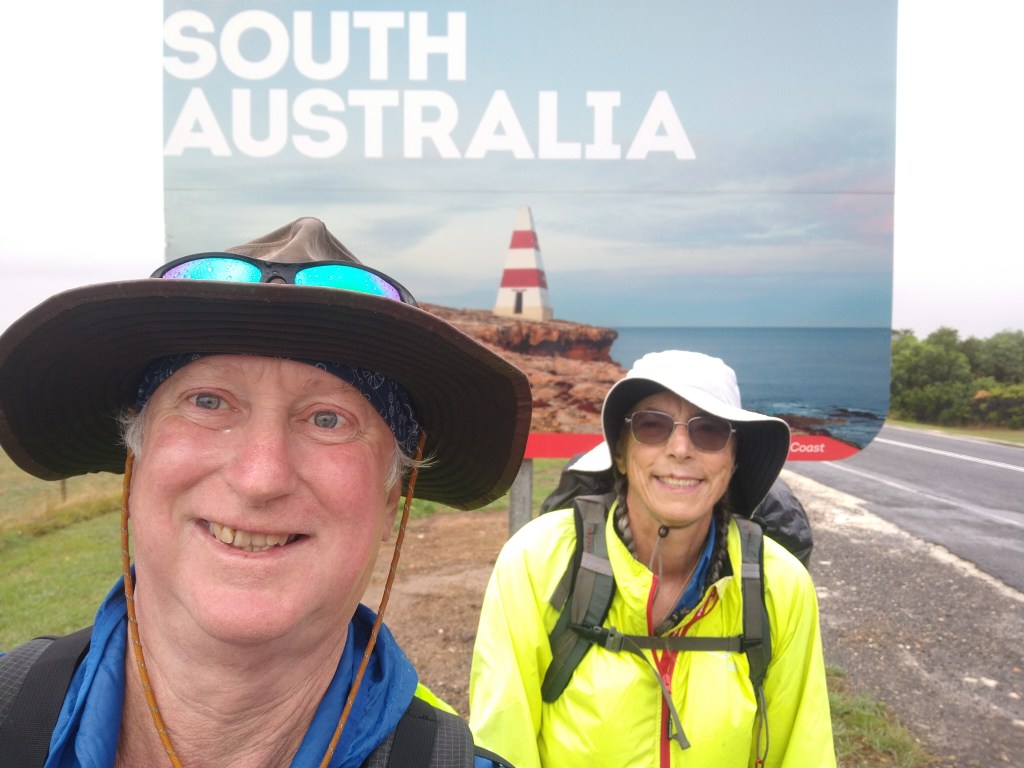 el Camino Australiano. Day 5. Lake Monibeong – Nelson. 22 Ckms. Chris, Boni, Carolyn, and Carlo had a wet walk along Discovery Bay to Nelson on lovely firm sand while I organised food drops and accommodation in Nelson and Port Macdonald. We’re staying in a lovely place called Nelson Cottages while it buckets down outside. Dinner at the hotel tonight.