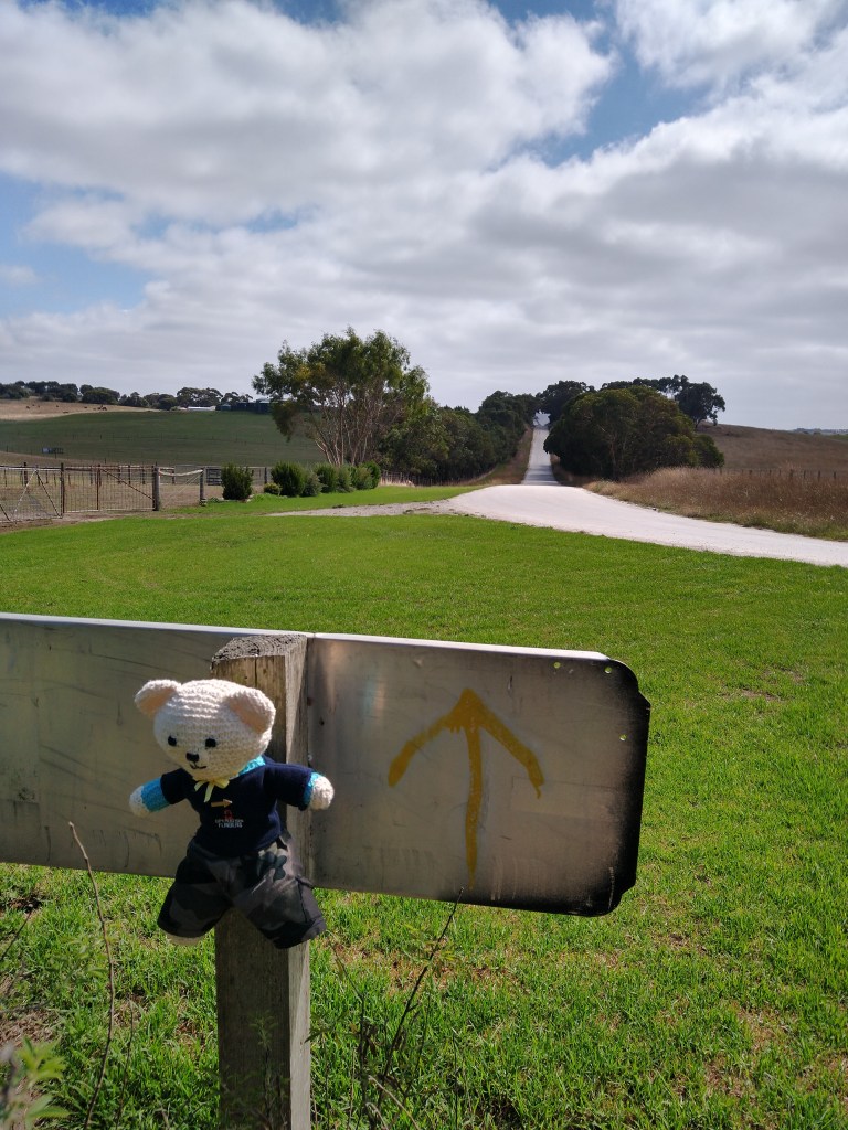 el Camino Australiano. Day 8. Port MacDonnell – Mount Schank – Mount Gambier. 28 Ckms. A lovely ramble along country lanes to Mt. Schank and onto the highway, 5 Kms from Mount Gambier. Mostly flat with wonderful cloud cover and a light breeze. We saw our first flecha amarilla.