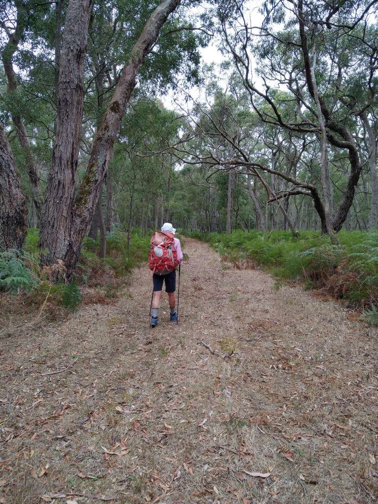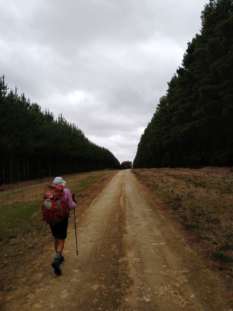el Camino Australiano. Day 10. Mount Gambier – Hinton Road – Bush Haven Cottages. 15 Ckms. A lovely stroll from the outskirts of Mount Gambier and then along Hinton Road which gradually devolved from bitumen to limestone to forestry road to bush track onto the cottages. Again, the cloud cover kept the sun off.