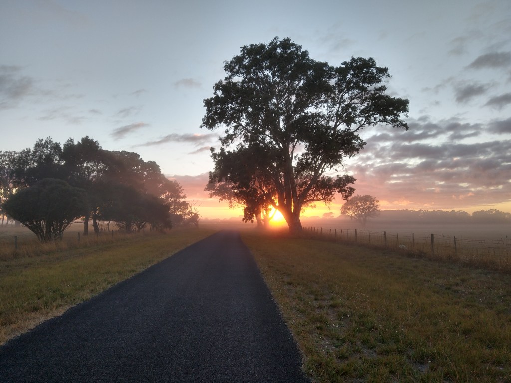 el Camino Australiano. Day 12. Kalangadoo – Krongart – Penola. 28 Ckms. A cold start to our final day saw us back on the rail line but we stick to side trails as much as possible. We didn’t see our first tiger till we were 12Ks along. Then we were back on country lanes all the way to Penola.
