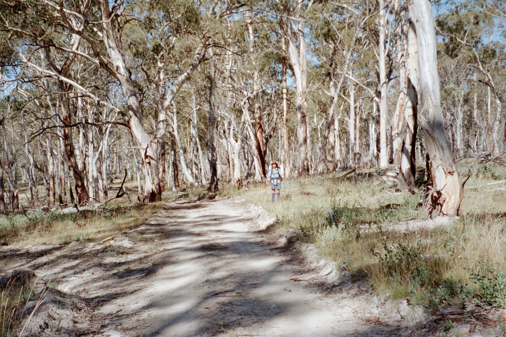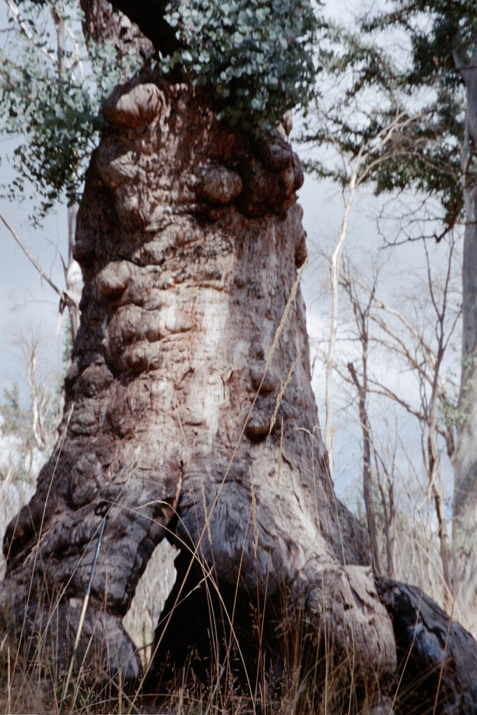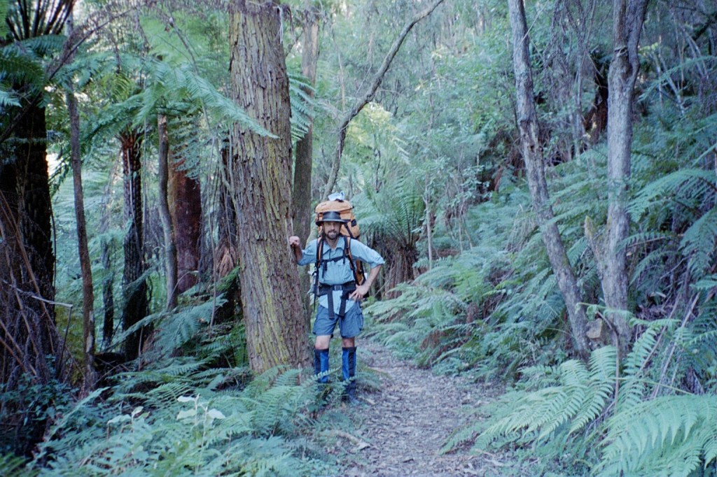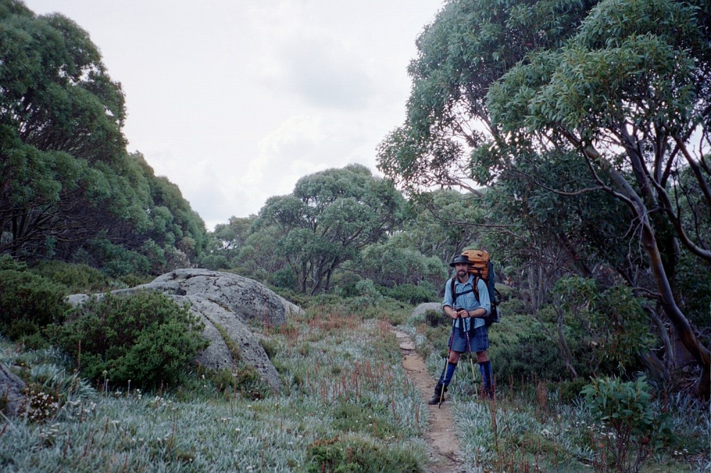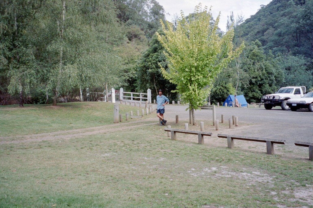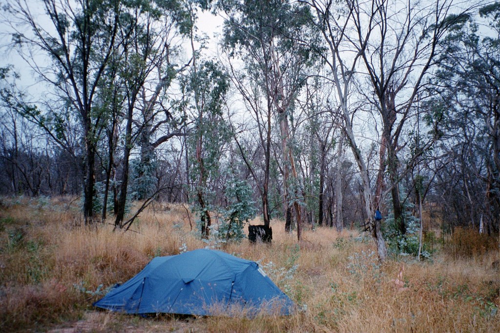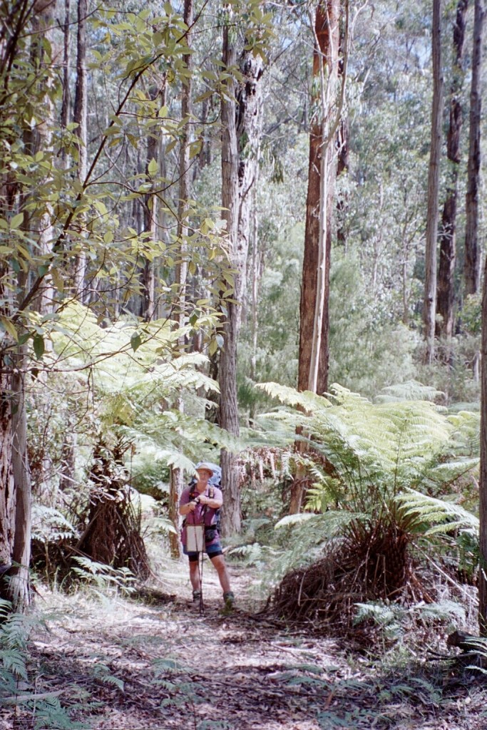 Rained overnight and a bit cold. First step @ 0820. Reached Mullers @ 0950. Two elderly ladies stayed there overnight. Same set up as Post & Rail. Pushed on to Sapling Creek by 1030. Sunny and overcast. Muller Fire Line then benched track along river. Reached Pattersons @ 1230. Lunched and discussed options. Two ladies said information woman had told them they could camp along the track. I mentioned Hirths Landing and they said we could camp there expecting the same facilities as Sapling. We decided to push on to Hirths. Geogeous track to Nelson Road. Sunny. Reached pseudo SA border @ 1715. Emus, wallabies, helicopter dragon flies, LBWs, black cockatoos and echidnas. Red clay and limestone, grass trees and melaleucas. Lis’ noticed tumours on gum leaves. I reached Hirths @ 1745. No toilet or water. Pushed on again to Simsons @ 2000. 32 km day. It seems the entire Geelong Grammar School is camped at Simsons. We had enough room.