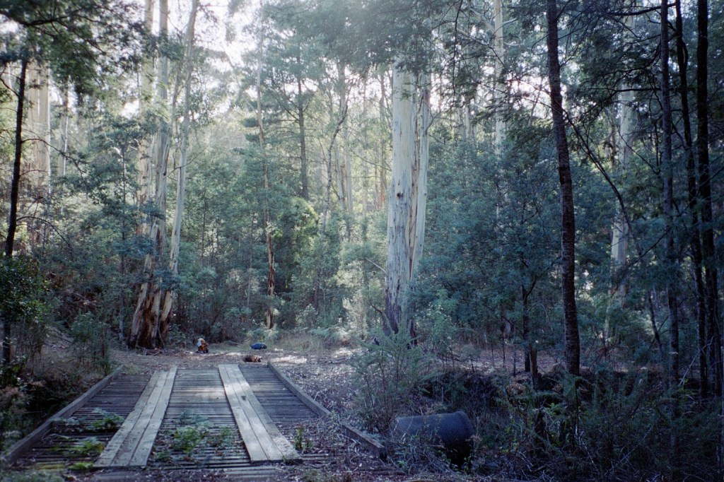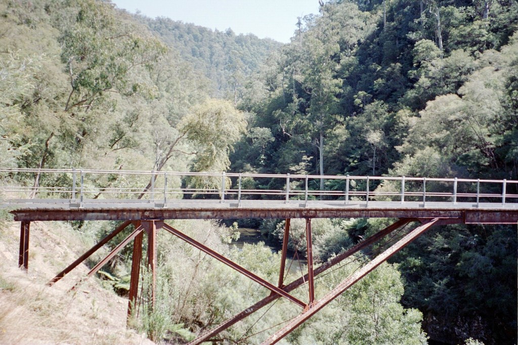 Niven and I have reached the iron bridge across the Thompson and the Baw Baw National Park. It has been a very pleasant stroll this morning. The tramway is just flat, easy walking. Well cleared and lovely. Lots of tree ferns and huge trees. It’s a lovely day to walk up the Thompson River valley. From here, we are going to continue up the valley, following the track until we get to Fingerboard Spur where we start the climb up to the Thompson Road where there is supposed to be a water point. It’s about 2 Ks from there to O’Sheas Mill. The bridge is quite substantial. It’s about 20 metres above the river, built in 1900 and all the original ironwork is still intact. It was built by engineers from the Victorian Railways. It’s easy 50 metres across the expanse and it is extremely convenient, that’s for sure. We arrived at O’Sheas at about three o’clock after quite a good first day’s walking. The climb up from the Thompson River wasn’t too bad at all. There were a few surprises. One of the was that one of the curves marked on the map didn’t exist which meant that we just kept on the track, straight, which led up to the main climb up Fingerboard Spur to the Thompson Road where we had lunch. From there we just followed the track down to the site of O’Sheas Mill. It’s a very nice campsite. It has a toilet, a picnic table and a very nice flowing creek. There’s a bit of a weir which forms a very nice pond. We had a bit of a wash and washed our clothing and hung everything out to dry. We sat round, had a cup of tea and a bit of cake. It’s still a very clear day. A few clouds forming but nothing really serious. Tomorrow we’re off to Mt Erica. We worked it out to be about a twelve-hundred metres climb from here. That should be OK as it’s over thirteen kilometres. According to Siseman (our guide book), after the first initial climb, the track comes to an open road which will make things a lot easier.