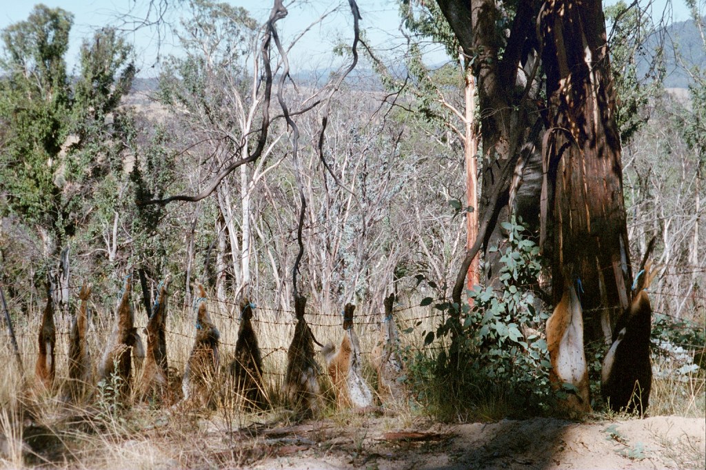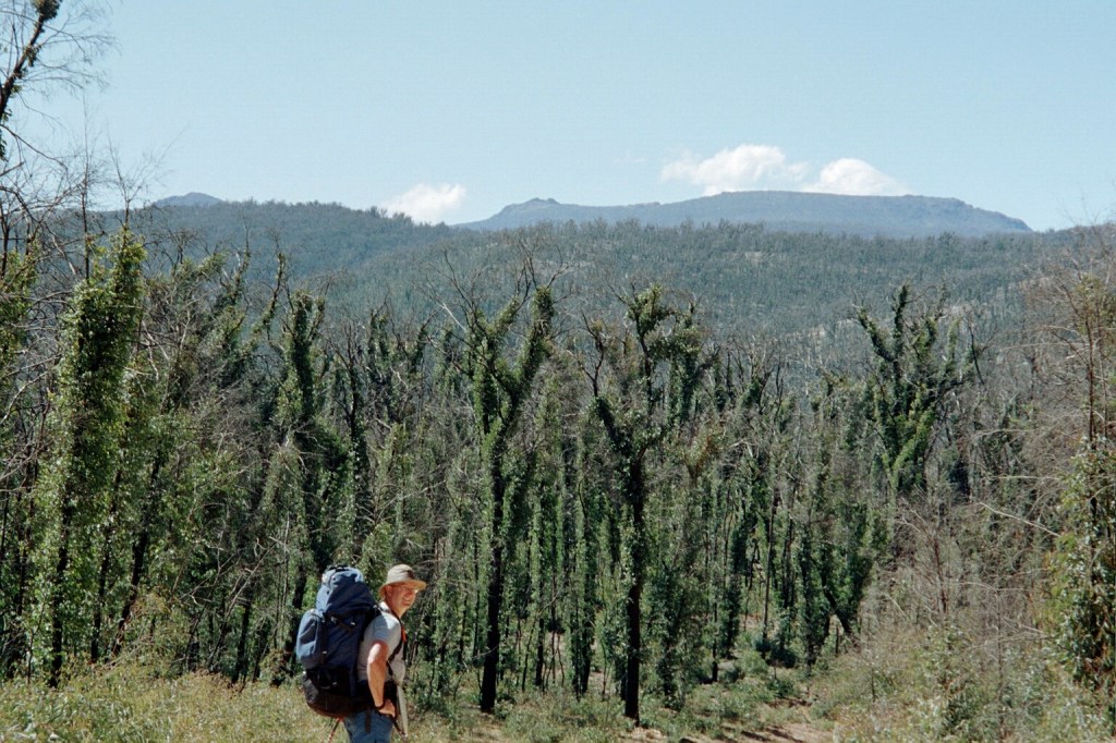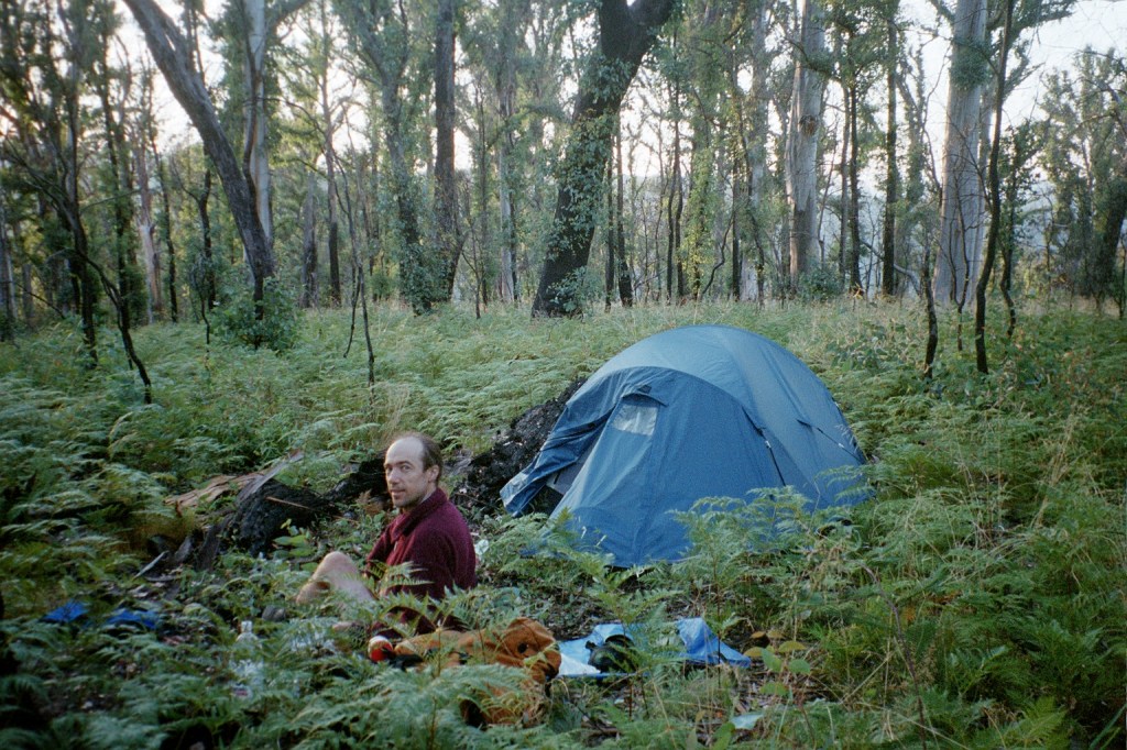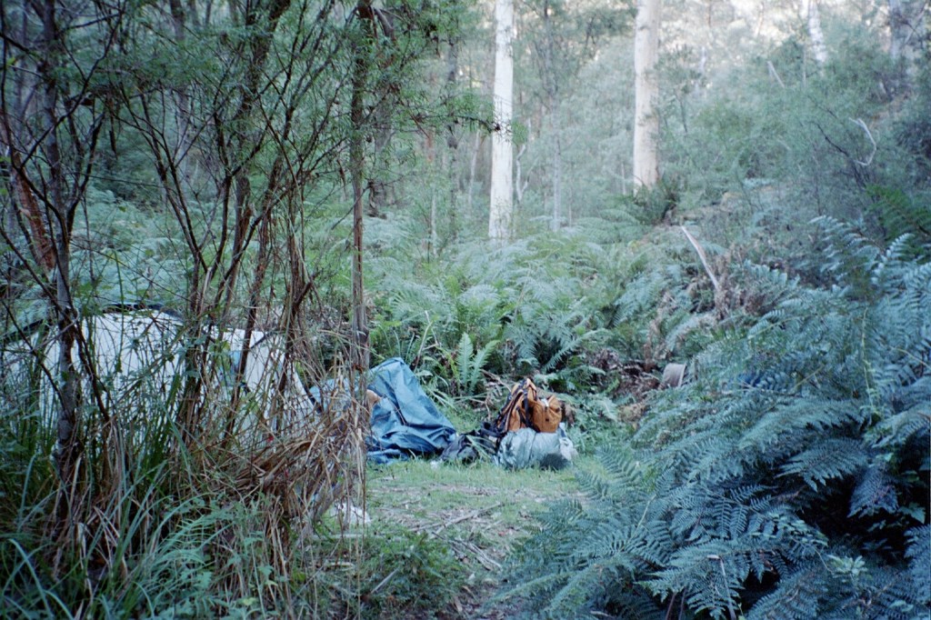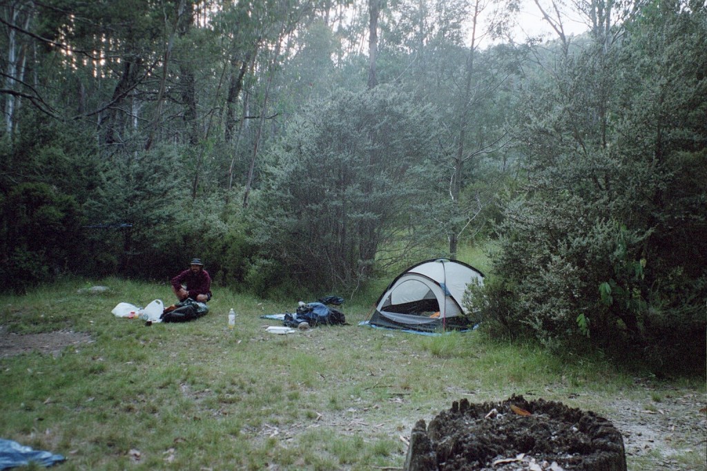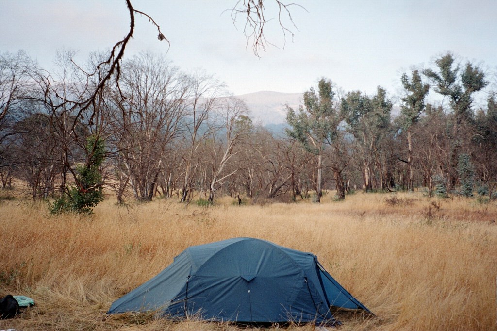 8 am. We’re at our campsite on the Beresford Road. After a sleep in yesterday morning we got away at 11.30. We sorted all our food out and returned the cache. Washed some clothes and dried them. Dried the tent out properly and repacked everything from scratch. We scrub bashed through a paddock at the start after we crossed the bridge at Taylors Crossing and eventually cut north to the dirt road in to the Alpine National Park. We passed a few paddocks, an eagle hanging on a fence, a dog hanging on a fence. They’re big at hanging whatever they shoot on fences around here. We followed the road until we got to the turn off to Morass Creek which was a steady climb up to a peak and then we followed a very rough foot pad which contoured all the way down to Morass Creek. It took us most of the afternoon to get down to Morass Creek. Again we didn’t have lunch until 4 pm. Then we had a very heavy scrub bash up the other side until we broke out into the open. We followed a very steady ridge line until we got to the Corryong Road. We followed the Corryong Road for a couple of Ks down to Stoney Creek where we filled up all our water bottles and from there to the turn off on the Beresford Road. We climbed for the rest of the day up the Beresford Road. All the way to here. We gained 400 metres. It’s all burnt out unfortunately. Last night we just kept walking and walking, trying to find a halfway decent campsite but we didn’t find any. It got to the point at about 8 last night that we decided to climb to the next ridge and just set up camp. So we got to the top of that ridge where one of the gates marked on the map was and from there we turned off up to the top of a knoll and set up camp amongst all the burnt out timber. It wasn’t great but it had to do. Another beautiful morning on the track. Today we’re heading for Johnny’s Top and then Buenba Creek. Before we leave we’re going to get all the maps out and look at the big picture.