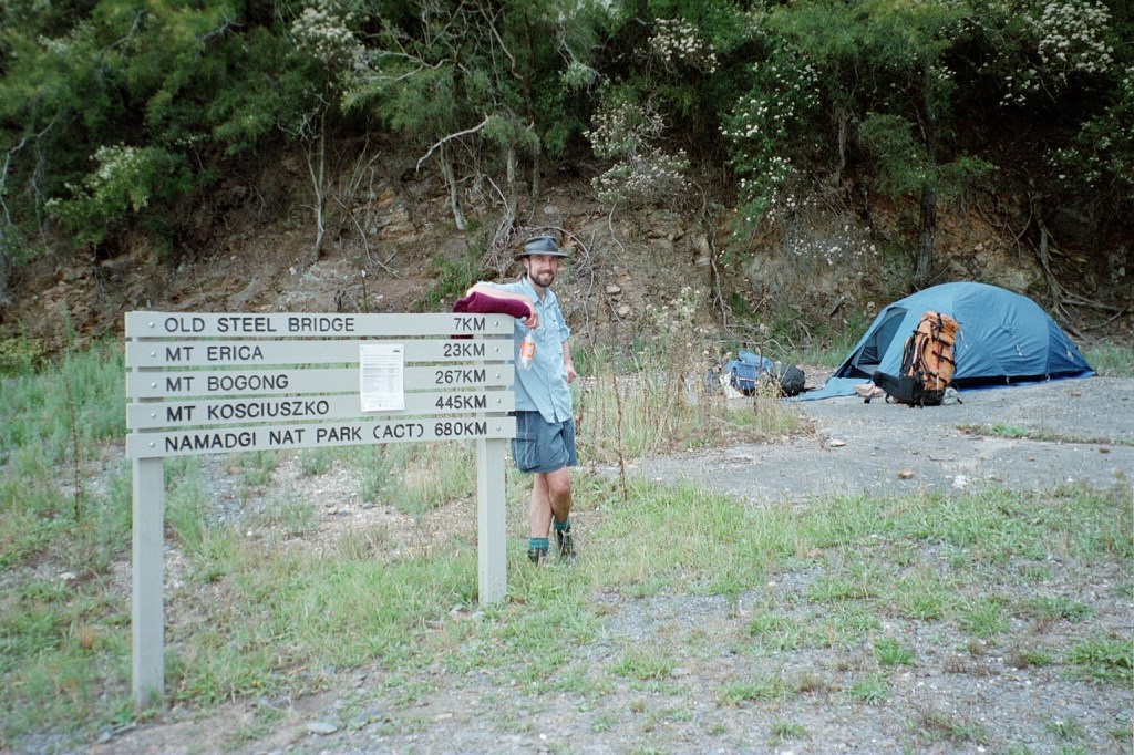 8.30 am. We’re about to start walking up the Limestone Road to the Alpine National Park. We left our campsite yesterday morning after consulting our maps and decided to have a day ambling and rambling along country roads instead of going up Johnnys Top and Buenba Creek. So we came down the Deep Creek fire trail, filled our water bottles at Deep Creek before moving into the farming areas along Morass Creek. It was a very nice little stroll. It started to get very warm at one stage. We got passed by a logging truck and a couple of four wheel drives and then as we were walking down the road a huge branch fell out of a tree about 10 metres in front of us just after I had pointed out to Niv that a car was coming towards us. So we cleared the branch off the road and the ute pulled in. It was a couple of people just having a look around the place and they offered us a lift to the Beluka Gap. So we got a lift all the way to the Beluka Gap and started wandering down the Limestone Road. We had lunch near some cattle yards and continued on to here. We set up camp up from the bridge over Morass Creek. We got here at about 3.30 pm, went down to the creek for a good wash and then came back, cooked up dinner and went to bed. It’s a very foggy morning. It’s either fog or very low cloud. It’s rather cold and the landscape is still very burnt out. Yesterday we saw our first kangaroos of the trip which is a good sign as it means they’re starting to move back into the area after the fires. It’s about 17 Ks along the Limestone Road to a bridge and a hut inside the Alpine National Park. From there, it’s only a hop, skip and a jump to the Cobberras and then on to Cowombat Flat which is 24 Ks past the hut.
