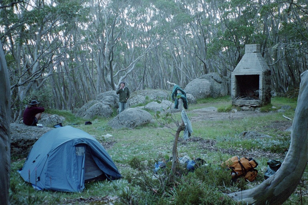 8 am. We camped last night on the upper reaches of Stoney Creek at a very nice place. We’re back in real alpine country now. Yesterday we left our campsite down on Morass Creek and walked the 12 Ks to the border of the Alpine National Park on a very well used but good dirt road. It was very easy walking. There was only one turn off which went to the Bunamba Mine which was a very good road indeed. Bitumen in fact. We passed another row of dead dogs hanging on a fence and just as we got to the watershed on the saddle, a ranger came by. He was full of information about the place. The whole area had been burnt out as had the hut we were heading to. He did, also, offer us a lift to Cowombat Flat as that was where he was going. We declined as this was one section that we wanted to walk. And I’m very glad that we did. We wandered down to the site of the hut and I kept thinking that we had made the wrong decision but after lunch on Limestone Creek, we wandered the 8 Ks to the Cowombat fire trail and then 2 Ks down to here and it was a lovely stroll. All up it was a 27 K day. It hadn’t started out to be that but that’s how it went. It’s only about 16 Ks from here to Cowombat Flat so, at the rate we’re going, we should be there by afternoon tea time.