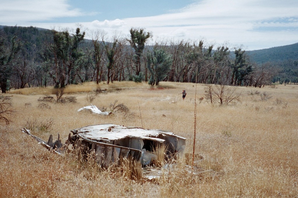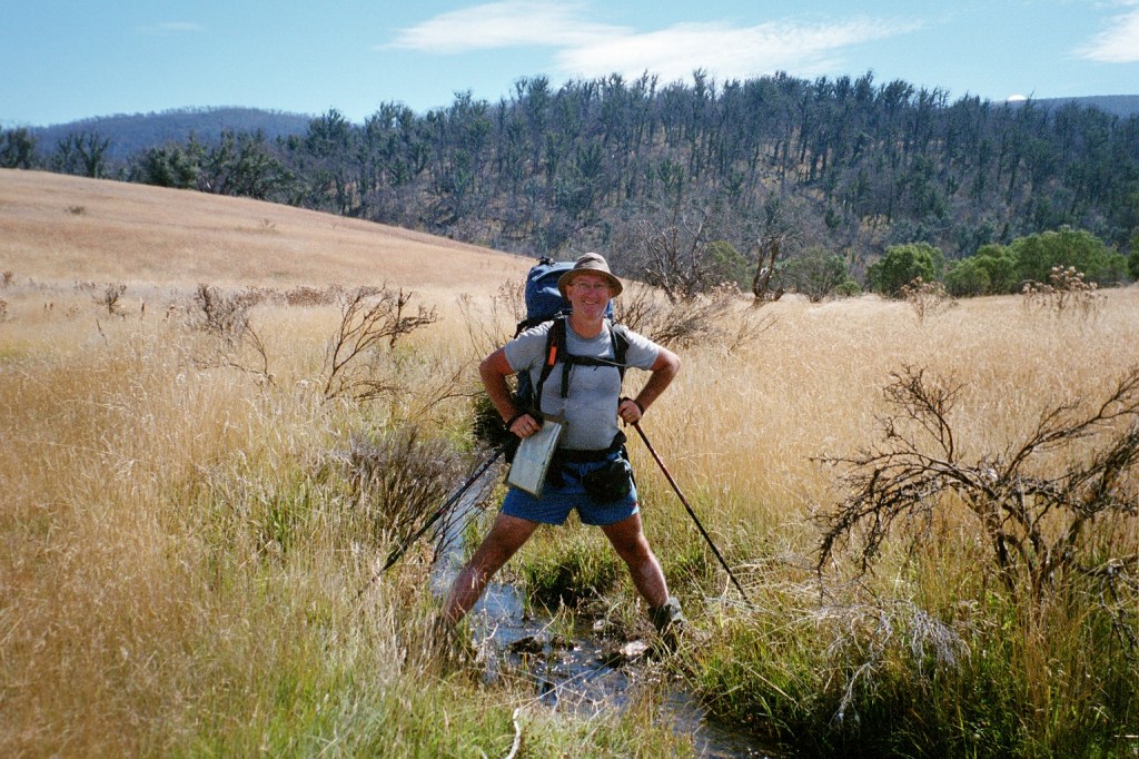 8.30 am. Yesterday we strolled down from Stoney Creek, which was dry all the way. It was a very easy stroll down. We got here in time for lunch at 1.30 pm. Cowombat Flat is very overgrown with grass. It must’ve been a real mown alpine meadow before the fires came through. The fires drove all the kangaroos and brumbies out so there’s nothing to keep the grass down now. It’s still lovely now though. We did our obligatory photo shoot with one foot on either side of the Murray River, straddling the NSW/Victorian border. Cowombat Flat is near where the Murray starts and the Murray makes up the majority of the NSW/Victorian border all the way to S.A. Forest Trig is just over there so this is the other end of the straight part of the border, the other being Cape Howe. I can’t remember when I stood on Cape Howe last. Yes, I can, it was on the Wilderness Coast walk. Anyway, it’s another beautiful day. There was a lot of smoke in the air yesterday and there’s still a bit about today. The wreck of a DC-3 is still here which made a forced landing here in 1954 after an engine failure . There’s only bits of the wings though. Today starts with a short climb of about 3 Ks up to Snow Gum fire trail and from there back to the Cowombat fire trail and down to Tin Mines where Carters Hut is and where we’re going to spend the evening. It’s only about 18 Ks so that should be this morning’s exercise.