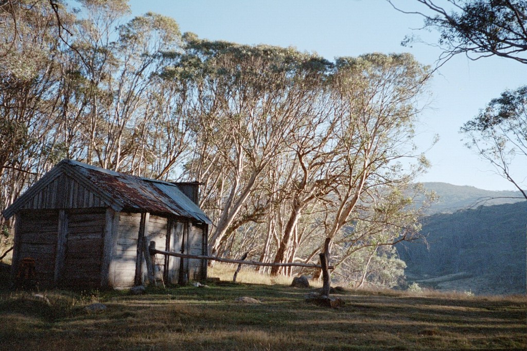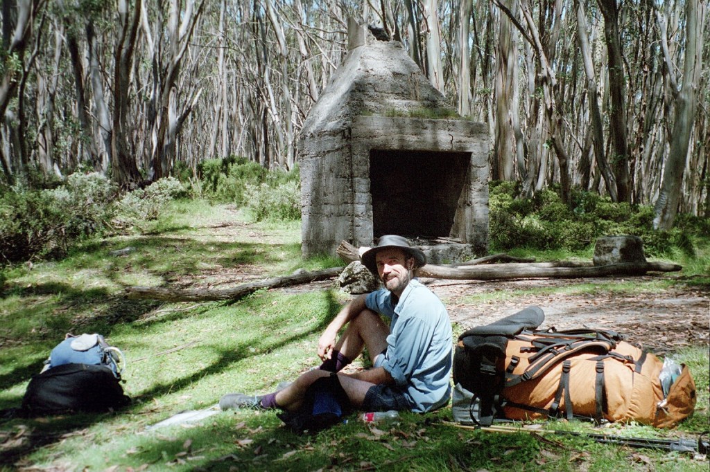 8 pm. I got to Grey Mare at 2.45 pm yesterday after an hour and three-quarters stroll from Valentines. The track has been bulldozed all the way and it looks like it continues. Today we’re heading for Mackey’s. It’s about 25 Ks from here. Past Mount Jagungal and the site of O’Keefe’s Hut, which was a shame to lose but we hope to have lunch there. Grey Mare hut is definitely one of my favourites. After I got here yesterday I went up to the mine and had a wash and washed my shirt, pants and socks and hung them out to dry. We had an early dinner and an early night in the hut. 11.45 am. There’s not a lot left of O’Keefe’s. The fire must have taken it out very swiftly. From the track you can see all the way to Tabletop and it’s all burnt along the way. They certainly built the hut in a lovely place. It’s a lovely site and is still a great campsite. The toilet’s still standing which is a bonus at any campsite. There’s a lot of thick grass to plough through to get to the creek. I’m just going to hang around here until Niv gets here and then we’ll have lunch and push on to Mackey’s. One thing about the site is that the hut’s footprint makes it seem a lot smaller than I remember the hut being. After walking around for a while you can make out where the bedroom, the main room and the bathroom come woodshed was. The hearth of the fireplace is actually quite big. The bulldozer tracks keep going which makes life easy if a little dusty.