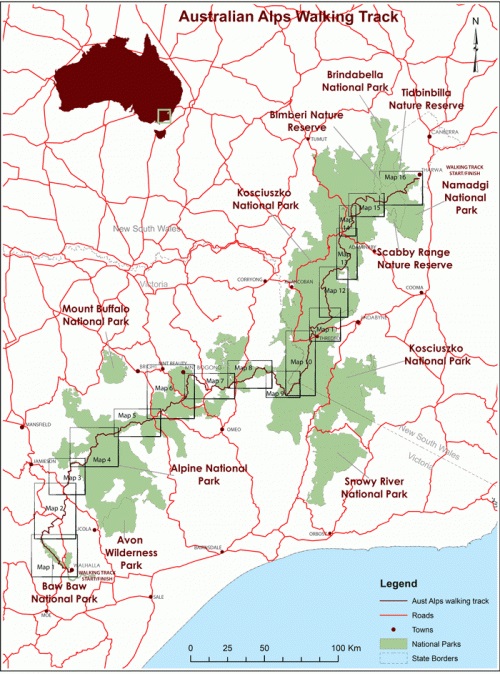 The Australian Alps Walking Track essentially follows the crest of the alpine range from southern Victoria through to the Australian Capital Territory. On the way it crosses all the highest mountain regions from the Baw Baw Plateau, the Mt Howitt area, the Bogong High Plains, the Cobberras then across Kosciuszko National Park, into the Namadgi National Park near Canberra then finally to Tharwa, A.C.T. It is a pure wilderness walk with only two towns, Mount Hotham and Thredbo along the way.