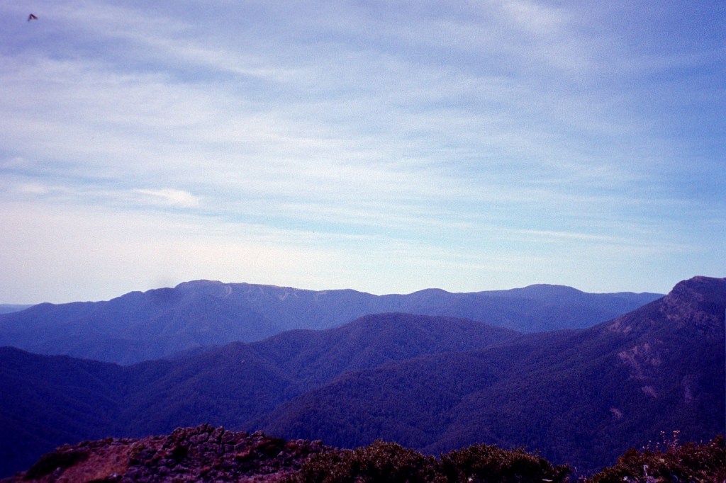 8 am. We had a very hard day yesterday, climbing up Mt McDonald. I found it extremely hard. Very rocky and very scrubby. We were constantly clambering up and down, over rocks, to get to the first of the peaks before the long climb up to the summit. I wasn’t feeling too good at all. I think I came down with whatever Niven had the previous day so that made me a bit weak but I seem to feel OK this morning. We are in a bad way in regards to water too. The last water we saw was back at the wheel rut near Low Saddle. Last night, when we got here, we wandered down the track for about a K and a half. All the creeks along the way were dry and it doesn’t look good from here on. So what we’ll do is push on to the Nobs and hopefully find water there. There’s supposed to be permanent water there but I’m not counting on it. We’ll cross over to Square Top and Mt Clear before coming back down to the King Billy Fire trail and then up to King Billy Saddle. From there I think we’re going to have a radical change of plans. We’re going to try and follow the King Billy Fire trail until we get to the Zeka Fire trail and follow that down to the Wonnangatta River. We’re going to abandon the attempt on the Crosscut Saw and the Viking. The water situation is just not good. It’s a very nice day. Very clear but very windy. It’s been blowing hard all night.