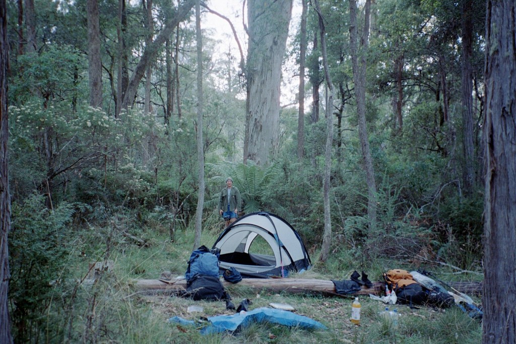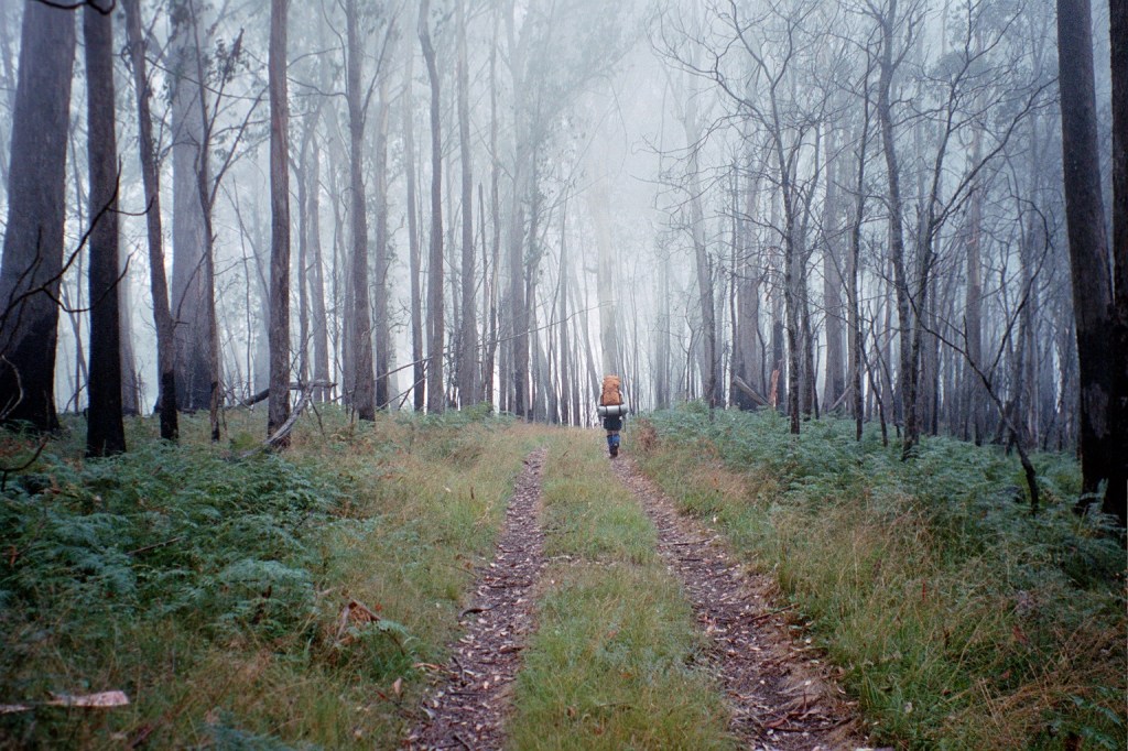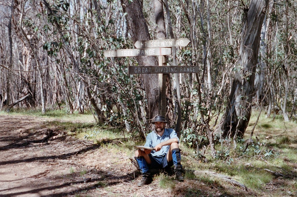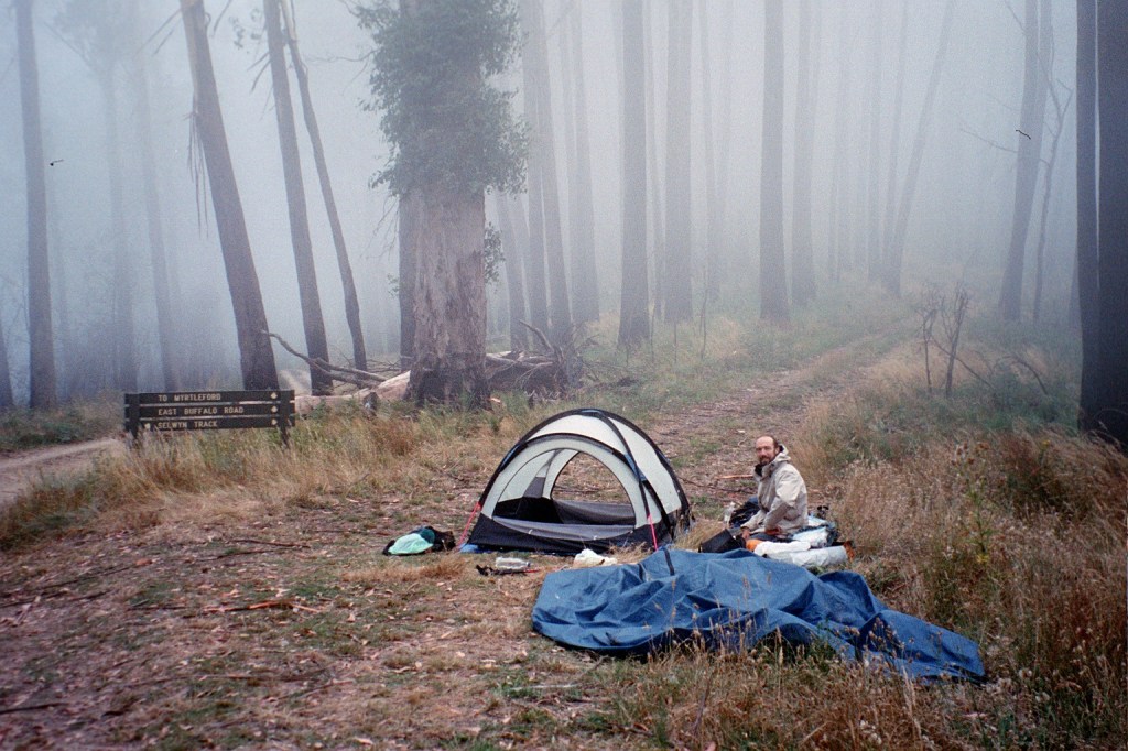 7.30 am. What started out as a nice little 10 K stroll up the road to Barry Saddle turned into a 22 K forced march all the way to the East Riley Road with a 28 kilo pack. It was another long hard day. The road up to Barry Saddle has been rerouted after the fires and it now comes out at the Van Damme Road. We followed the Van Damme Road up to the Selwyn Track and then followed it to Siseman’s suggested campsite on the saddle. We got there and decided that it wasn’t particularly pleasant. The area was burnt out and there wasn’t a great deal of flat ground. We got Siseman out again and he mentioned a water tank several saddles over. Those several saddles added another 400 metres to our climb for the day but it was worth it to get to the water tank. It survived the fires. Just. From there we followed the track down to the next saddle where we hoped to camp but again the area had been burnt out with no flat ground. It was about 7 pm at this stage so we decided to push on to the junction of the Selwyn Road and East Buffalo road to Porepunkah. It is a better site. Flat but still in burnt out forest. We awoke this morning to be in the middle of cloud for the first time. It’s cold, moist and very windy. There’s this piece of bark about twenty metres up a tree that has been flapping all night. When I first heard it, I thought it was just outside the tent. I had a look but couldn’t find it. It’s about 16 Ks to Mt Murray today along the Selwyn track to our next campsite. We’ll gain another 600 metres.