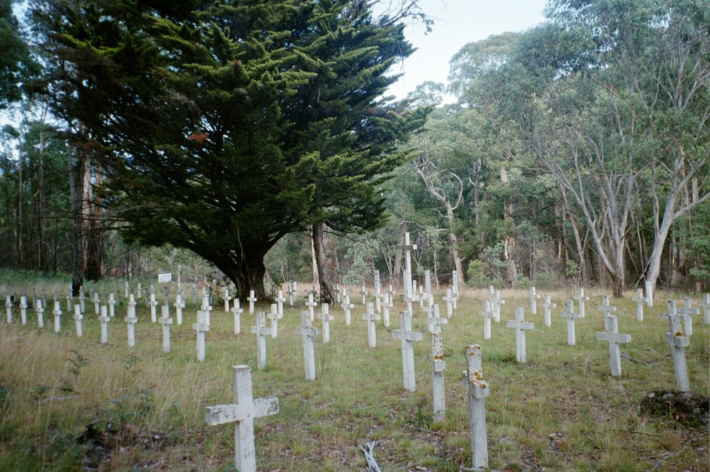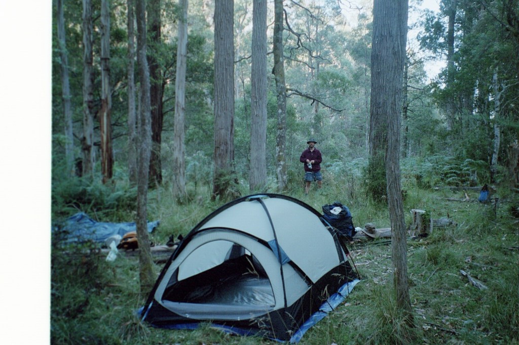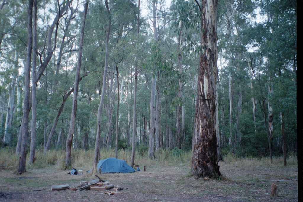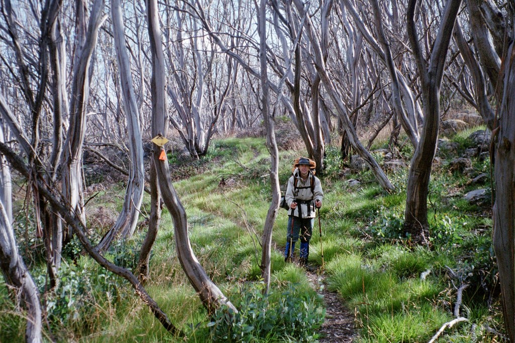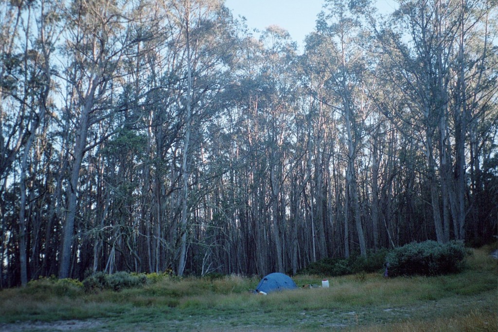 7.30 am. What started out as a nice little 10 K stroll up the road to Barry Saddle turned into a 22 K forced march all the way to the East Riley Road with a 28 kilo pack. It was another long hard day. The road up to Barry Saddle has been rerouted after the fires and it now comes out at the Van Damme Road. We followed the Van Damme Road up to the Selwyn Track and then followed it to Siseman’s suggested campsite on the saddle. We got there and decided that it wasn’t particularly pleasant. The area was burnt out and there wasn’t a great deal of flat ground. We got Siseman out again and he mentioned a water tank several saddles over. Those several saddles added another 400 metres to our climb for the day but it was worth it to get to the water tank. It survived the fires. Just. From there we followed the track down to the next saddle where we hoped to camp but again the area had been burnt out with no flat ground. It was about 7 pm at this stage so we decided to push on to the junction of the Selwyn Road and East Buffalo road to Porepunkah. It is a better site. Flat but still in burnt out forest. We awoke this morning to be in the middle of cloud for the first time. It’s cold, moist and very windy. There’s this piece of bark about twenty metres up a tree that has been flapping all night. When I first heard it, I thought it was just outside the tent. I had a look but couldn’t find it. It’s about 16 Ks to Mt Murray today along the Selwyn track to our next campsite. We’ll gain another 600 metres.