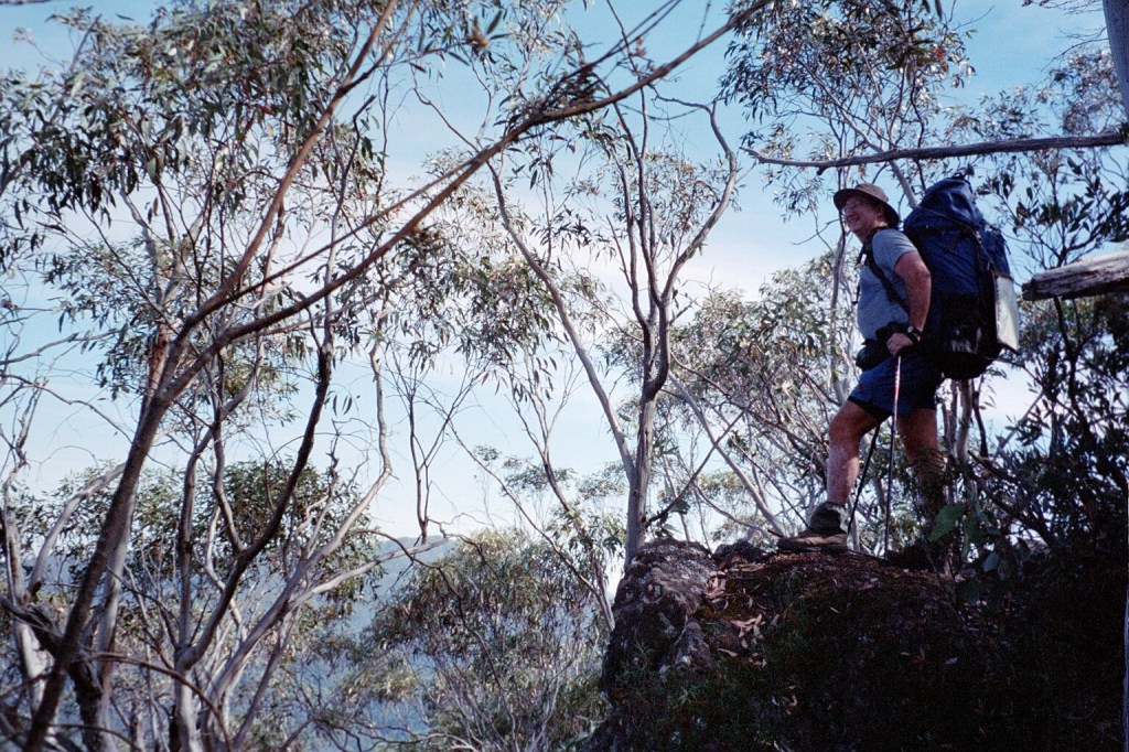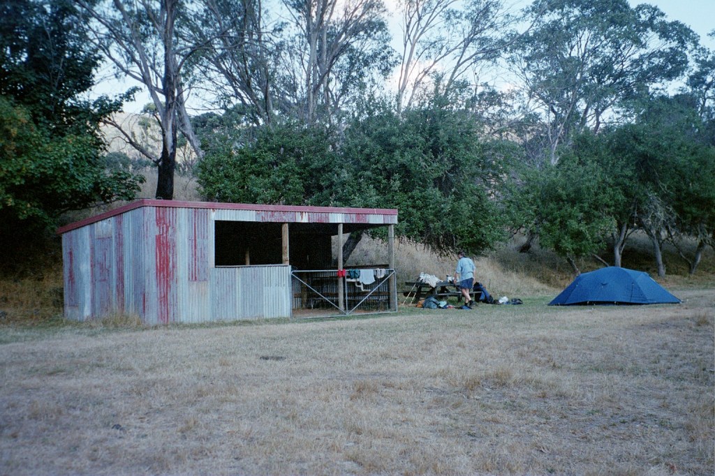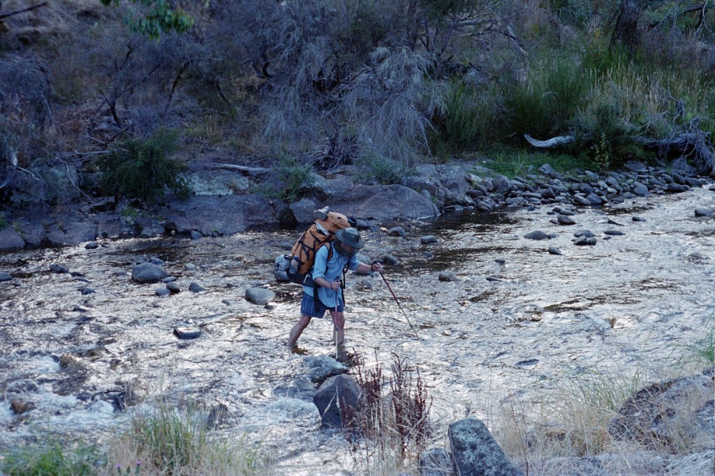 9 am. Yesterday was a very long day. After lunch yesterday, we went down to the Zeka Fire trail and followed that along. Unfortunately when we got to where the Zeka Creek Fire trail was supposed to be was heavily overgrown and non negotiable. So we had to take the Zeka Spur Fire trail which was a very long haul. We had to climb back up to 1400 metres and then descend down to 500 metres. About two thirds of the way down a couple of guys, horsemen, in a Nissan Patrol without any back seats came along and said, “Pile in.” So we did and they gave us a lift all the way to the Rileys Fire trail turnoff just up from the river. It was a lot further than we had anticipated. We got into camp at about seven o’clock, went down to the river and had a really good wash, filled up our water bottles, sat around and had tea and we went to bed after the moon came up. This morning we’re heading up Rileys Fire trail to Barry Saddle. It’s ten Ks and two 300 metre climbs with a 200 metre descent half way. We have filled up every water container we have including the 4 litre wine bladders. Hopefully, that will be enough water for the next couple of days. So, I’m carrying 8 kilos of water. It’s another beautiful day. There are lots of birds around.