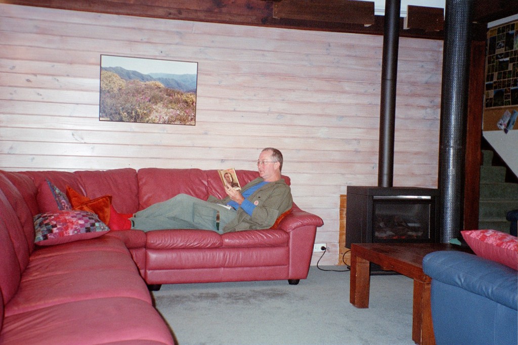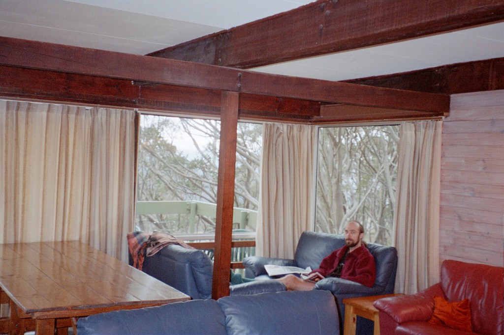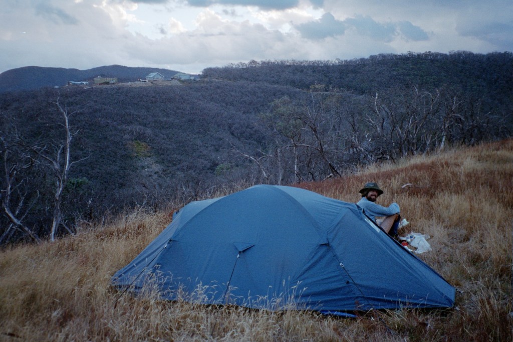 Noon. We got up early yesterday and hiked down to here. It was about 12 Ks all up as the backpackers is on the other side of Mount Hotham. It was really lovely to get here. We got in, unpacked, had a shower and put some clean clothes on. We’ve met some very nice people here, Angie and Zoel, who work here in Winter. Zoel is doing IT engineering at Melbourne Uni. They introduced us to Chai Tea which is a spicy Indian tea with some walnut shortbread. Zoel is right into alternative energy sources and he wants to convert a Mitsubishi L300 van into an energy efficient 4-wheel drive. Anyway, we then wandered up to the General, which is the supermarket/store/pub all of 100 metres up the road. We had a huge hamburger each with the lot on it. We came back down to here and did all our washing, dried out the tent and squared all our gear away. Yesterday evening we went back up to the General and had a beautiful pizza for tea. It was a half vegetarian/half meat lovers. The vegetarian side was by far the best. It had zucchini, onion and sweet potatoes. We came back and there’s an Aboriginal archaeology team here doing a survey of the now exposed sites after the bushfires. They’re going to be here for six days. The fires did a tremendous amount of damage to the bush but they did expose all these undiscovered sites. When we woke up this morning, it was raining hard. Severe mountain rain with high winds. I didn’t get up until nine o’clock and then had a breakfast of wheatbix with fresh pears. Chris, the manager here, took us down to Dinner Plain after breakfast and we bought a whole stack of fresh vegetables and a couple of steaks for dinner tonight. It’s still raining, on and off. I hope this will blow itself out by tomorrow. We’ve finished sorting out our food cache and just have to repack our packs so they are ready to go. I’m getting rid of a lot of stuff I don’t need so I can get my pack weight down some more. I’m also sewing up my inner sheet which desperately needs it. All our washing is hanging up in the drying room. It’s a real luxury to be able to lounge around in clean clothes. I plan on spending the rest of the afternoon relaxing.
