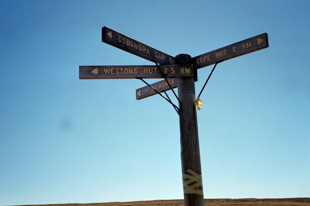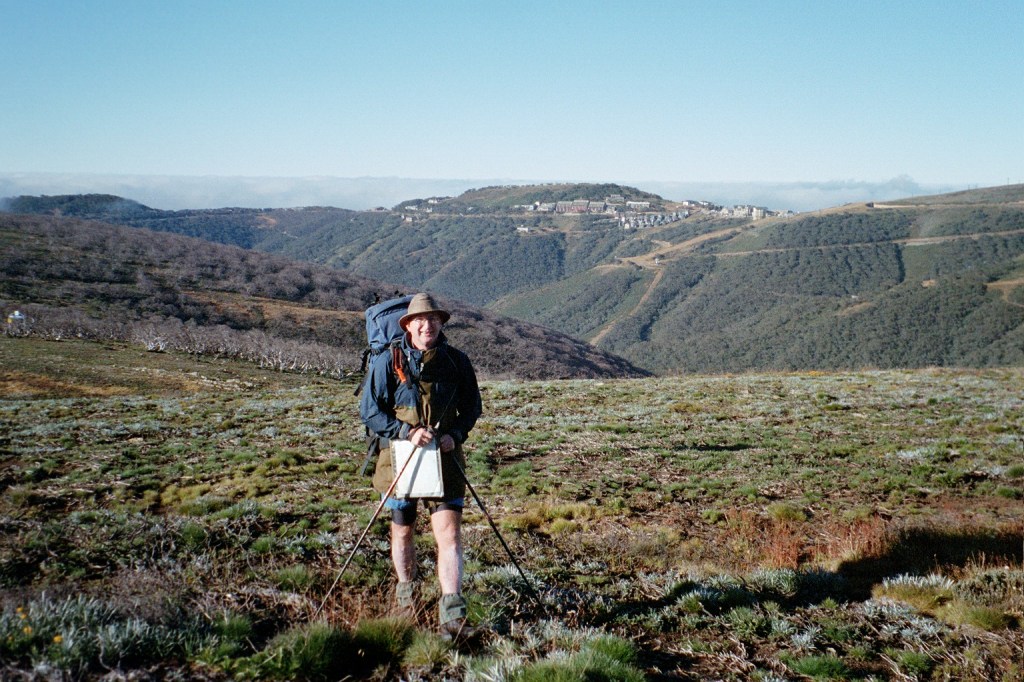 9 am. We’re just leaving Rumpff Saddle. I’m very happy to say that our food cache was intact when we got there yesterday afternoon. Yesterday turned into another long day after all. Nothing untoward, it just turned out to be. The climb up Mt Shillinglaw was the main climb of the day and from there it was just a long stroll along the road. We got to the cache at twenty past four, sorted things out and got going again at twenty past five. Rumpff Saddle is not a bad place. No water though. Nothing down the track to Frog’s Hollow. Unfortunately, Niven had a bit of an attack of the runs. Hence the late start this morning. He’s still not feeling the best. So this morning we’re just going to wander through to Low Saddle. That does mean, however, that somewhere along the line we’ll have to gain another day. It’s about a K from here to the Foresters Hut and about 2 Ks from there to a dam. Hopefully, we’ll get water at one of them. It’s a beautiful day but very windy and chilly.