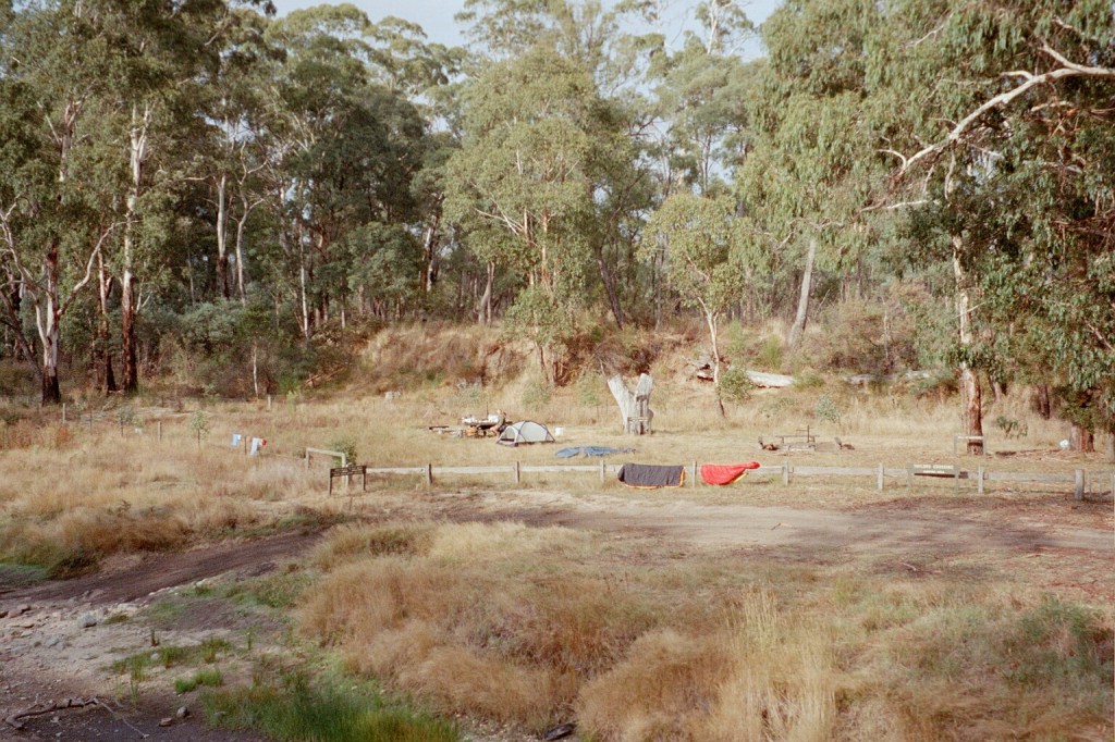 7.45 am. Happy Birthday, Dad. We got here late yesterday evening. About six. It was a bit of a hard scrub bash down the old fire trail back to the Mt Sunday Track but we got here. We set up camp and had a wander down the road to where the well was supposed to be to try and find some water but unfortunately we couldn’t find any usable water. We found the well OK after a bit of a look around. We came back up to our campsite and there is a very large wheel rut full of muddy water on the track. We skimmed a lot of water off and filtered it after letting the sediment settle. Today we’re off to climb Mt McDonald. It’s ten Ks from here to Long Saddle with a 900 metre climb. If we can get there by lunchtime, that might be a bit of a pipe dream, we’ll have lunch, get down the other side and decide whether we’ll push on to the Nobs which are only ten Ks down the fire trail. Of course, that depends on the condition of the fire trail.